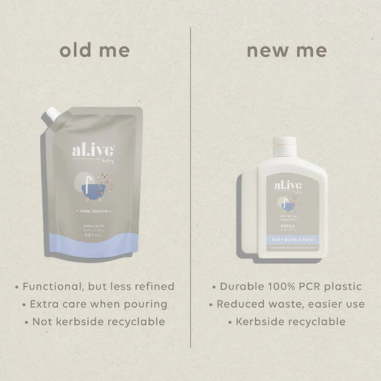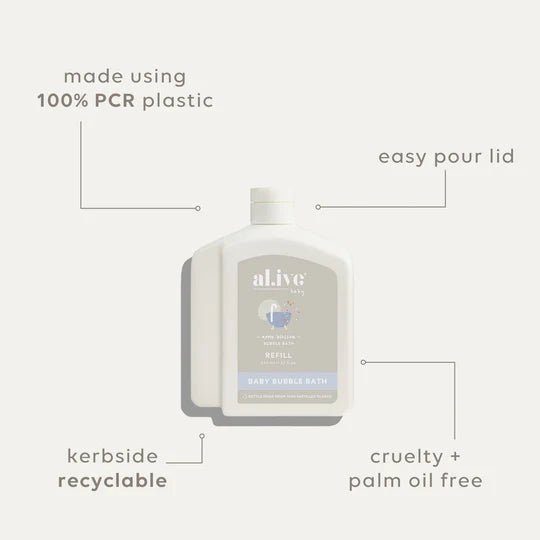 Each refill is designed to refill the 320ml al.ive baby Bubble Bath bottle twice, with a little to spare. Featuring a controlled-flow spout for mess-free pouring, a compact shape for easy storage, and full kerbside recyclability, it offers a practical, premium solution while extending the life of the product you already love.