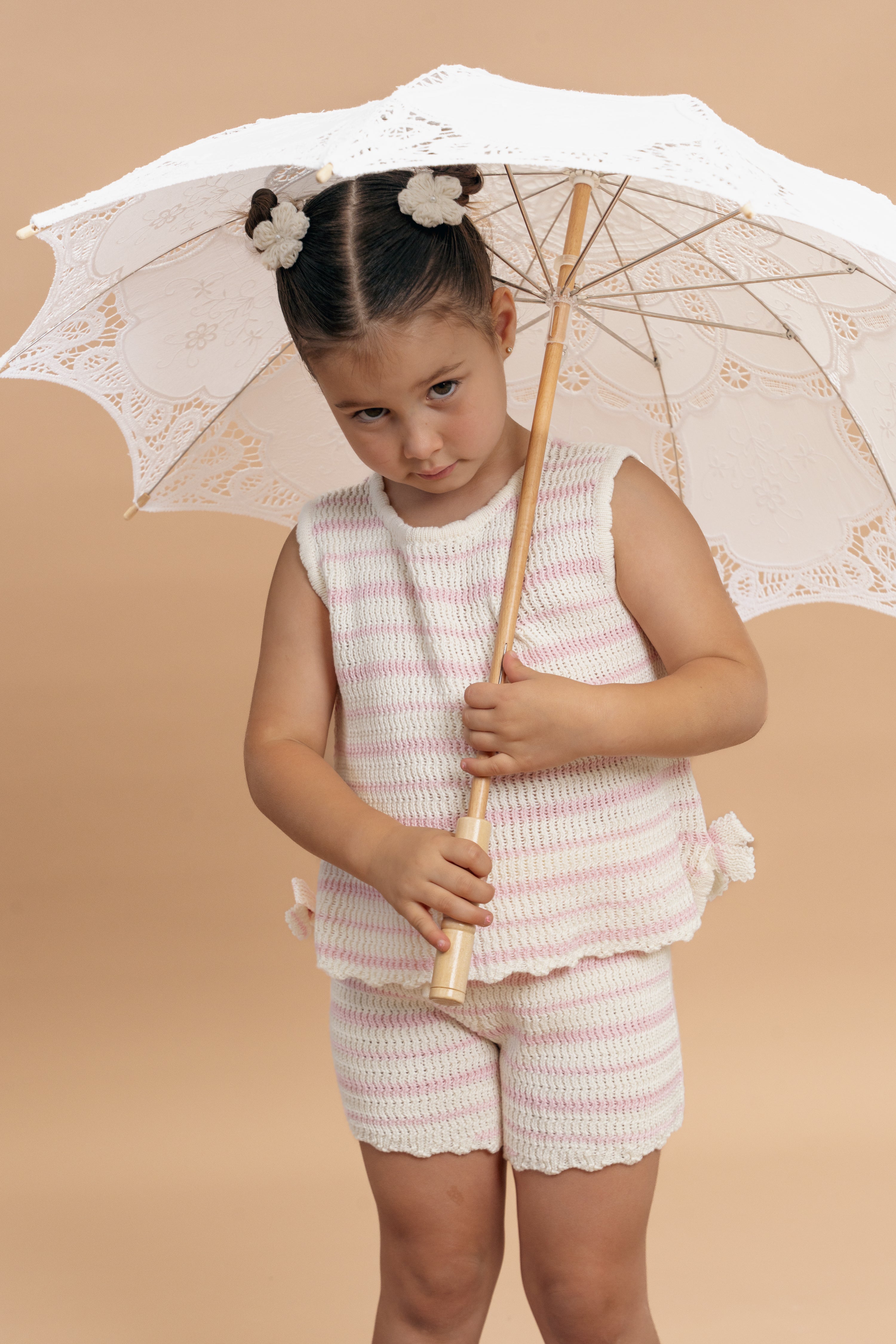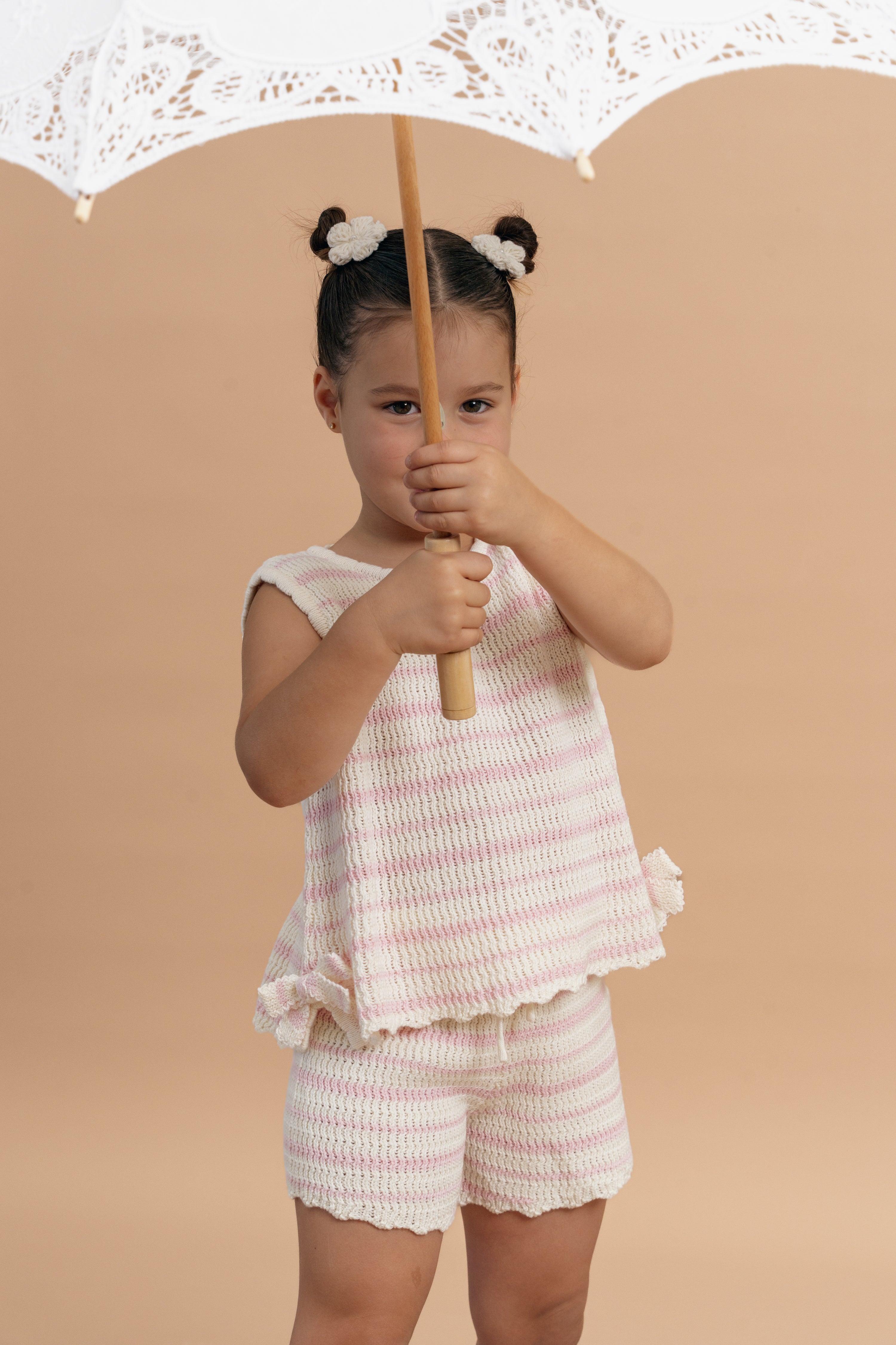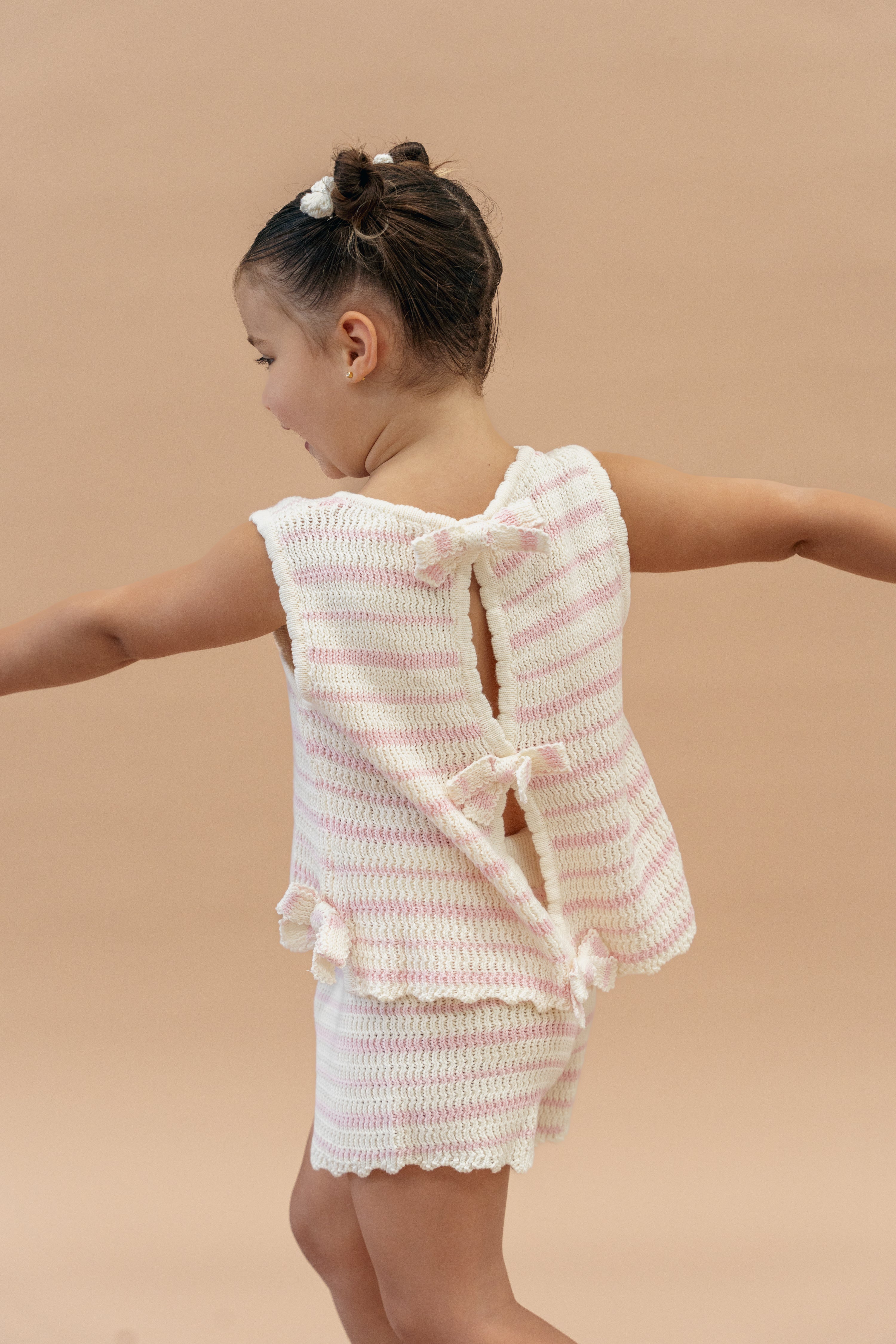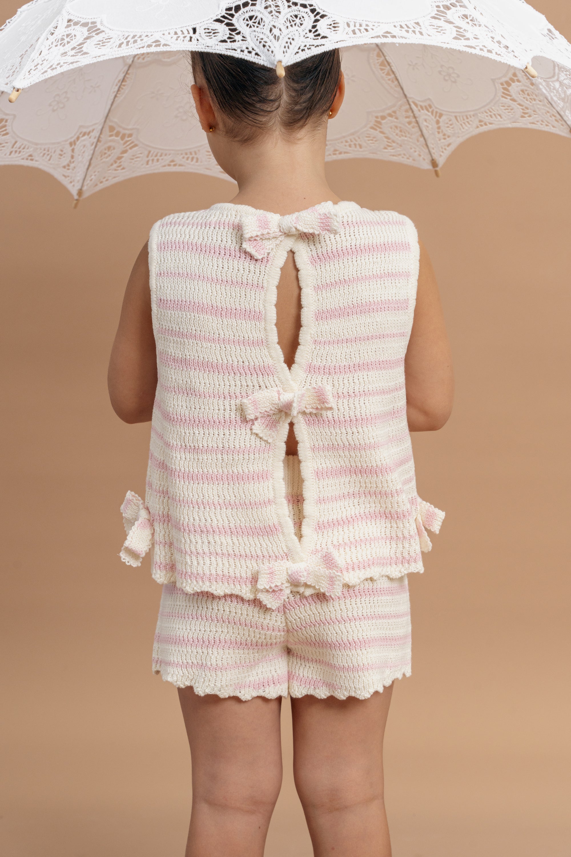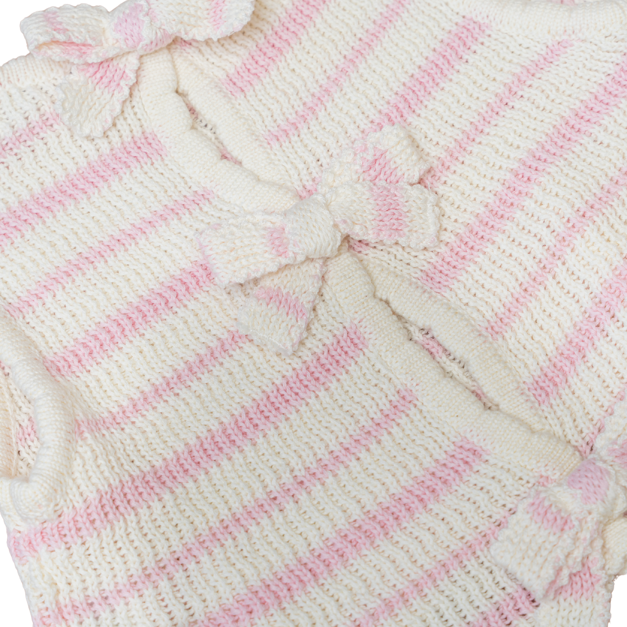 Our adorable Strawberry Bow Knit Set features a gorgeous stripe print with delicate bow detailing throughout the back & sides. Crafted from a premium cotton knit fabric, this set offers a soft, breathable feel perfect for little ones every day wear while also staying in style!