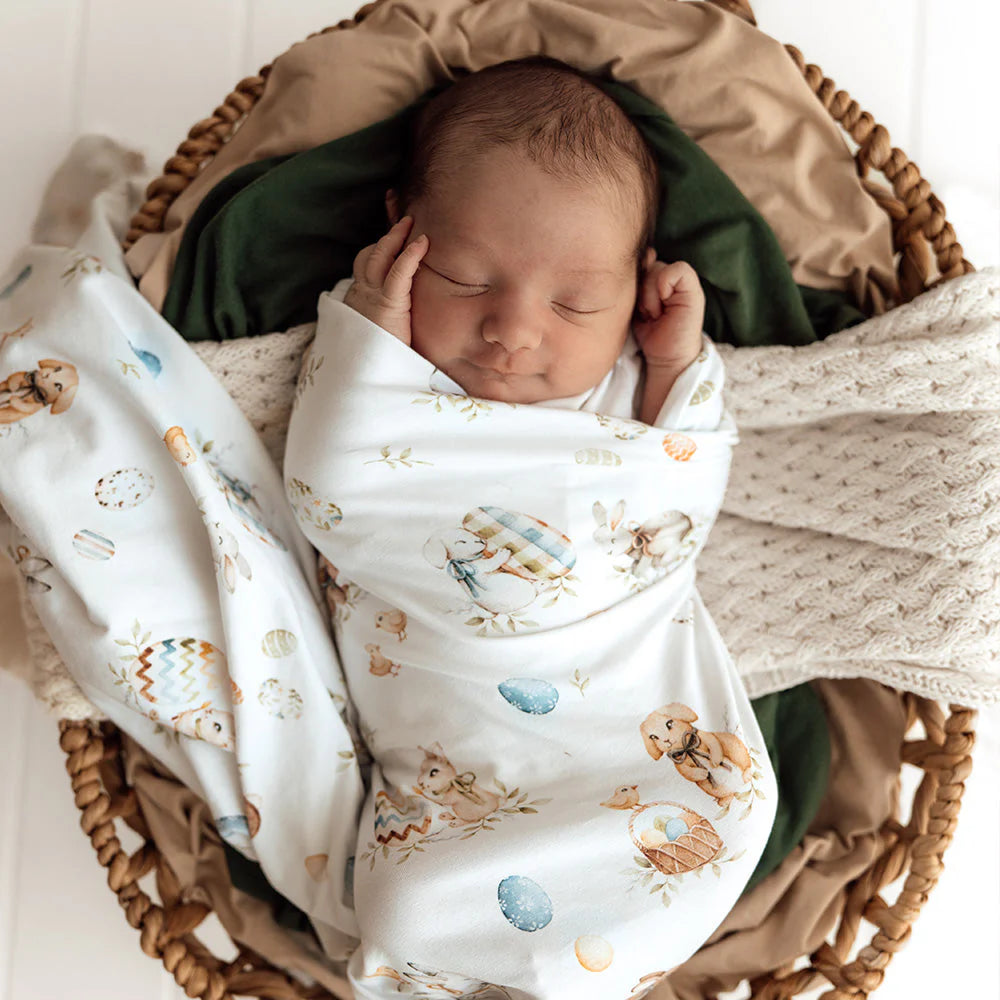 Our Snuggle Hunny organic cotton jersey wrap with matching beanie is soft, snuggly and stretches with baby. This wrap features our exclusive Snuggle HunnyFlopsy Bunnies design and is made with Organic Cotton.