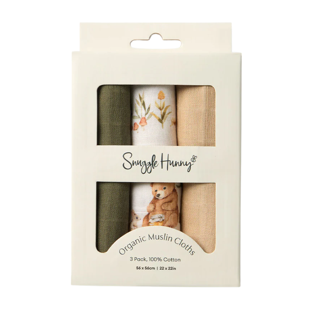 SNUGGLE HUNNY SMALL MUSLIN CLOTHS 3 PACK - BEARS/OLIVE/PEBBLE