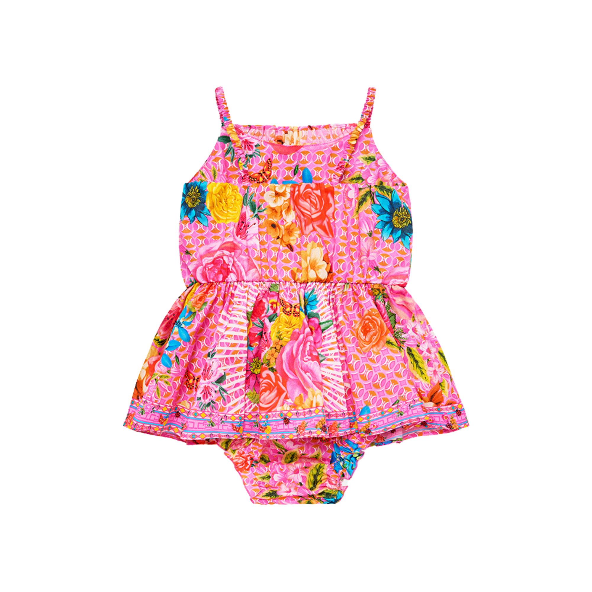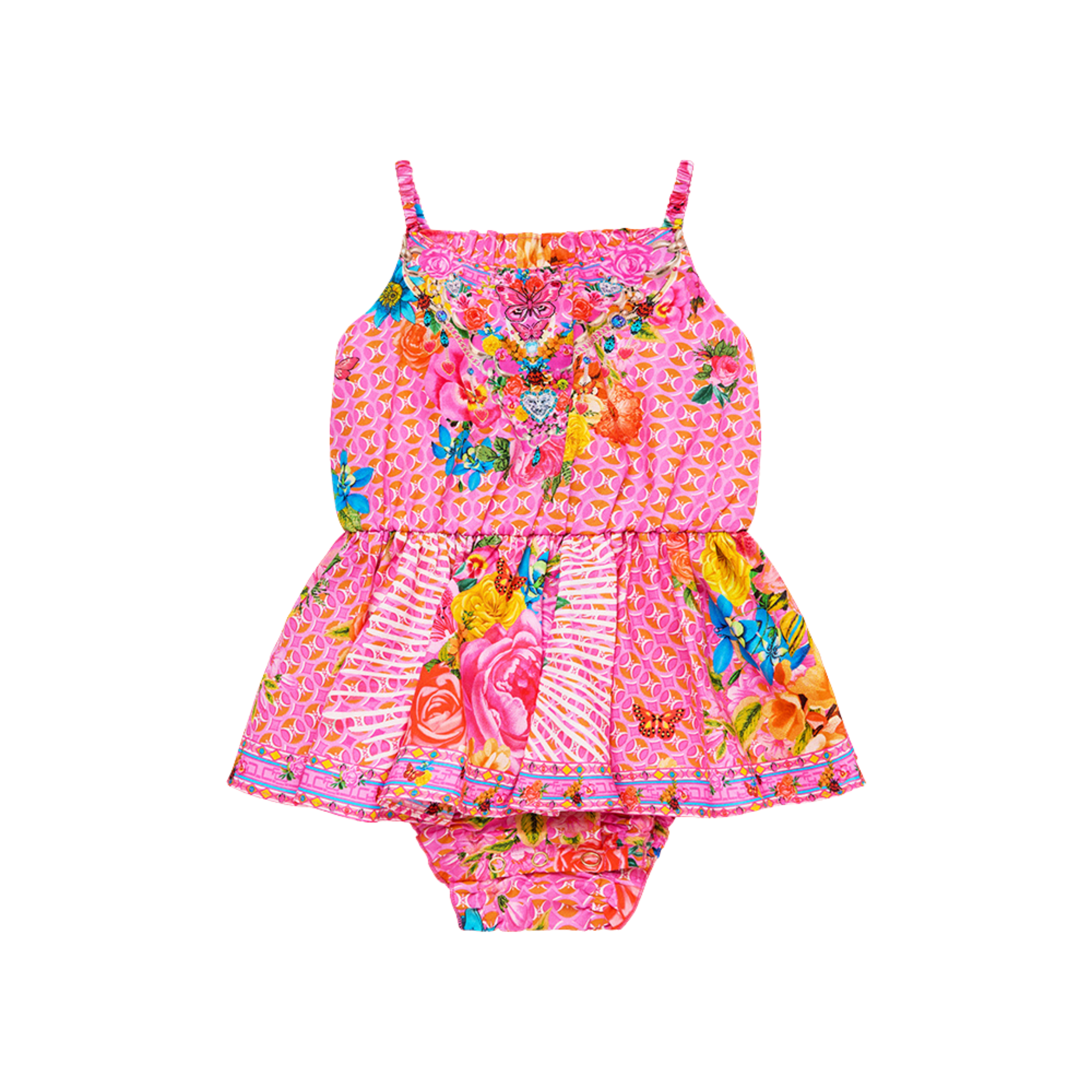 The Illustration Nation Babies Jump Dress With Frill Neck is a handcrafted silhouette designed by our in house artisans. Reimagined in an exclusive limited edition print, our babies jump dress features a scooped neckline with frilled edges and a gathered full skirt layered over soft bloomers with frilled leg lines.