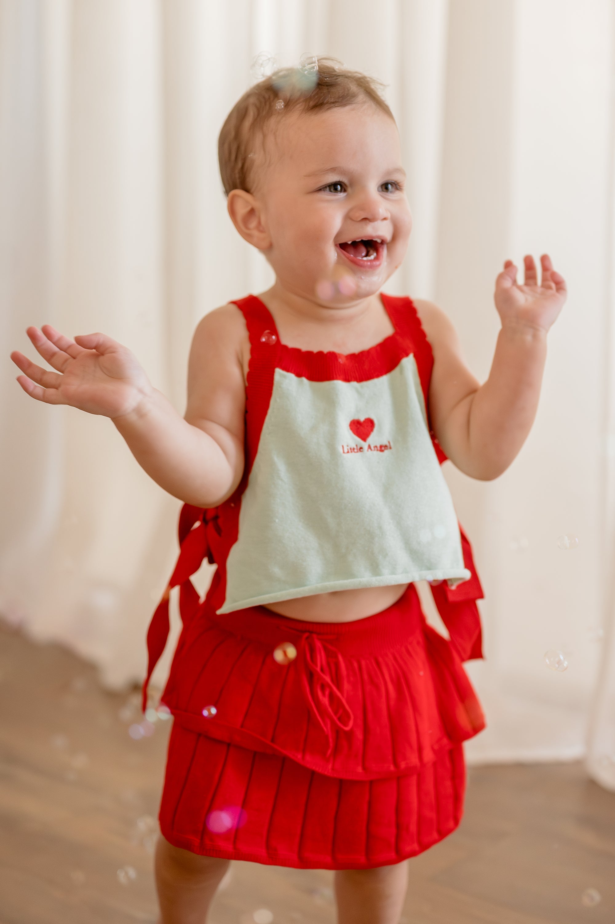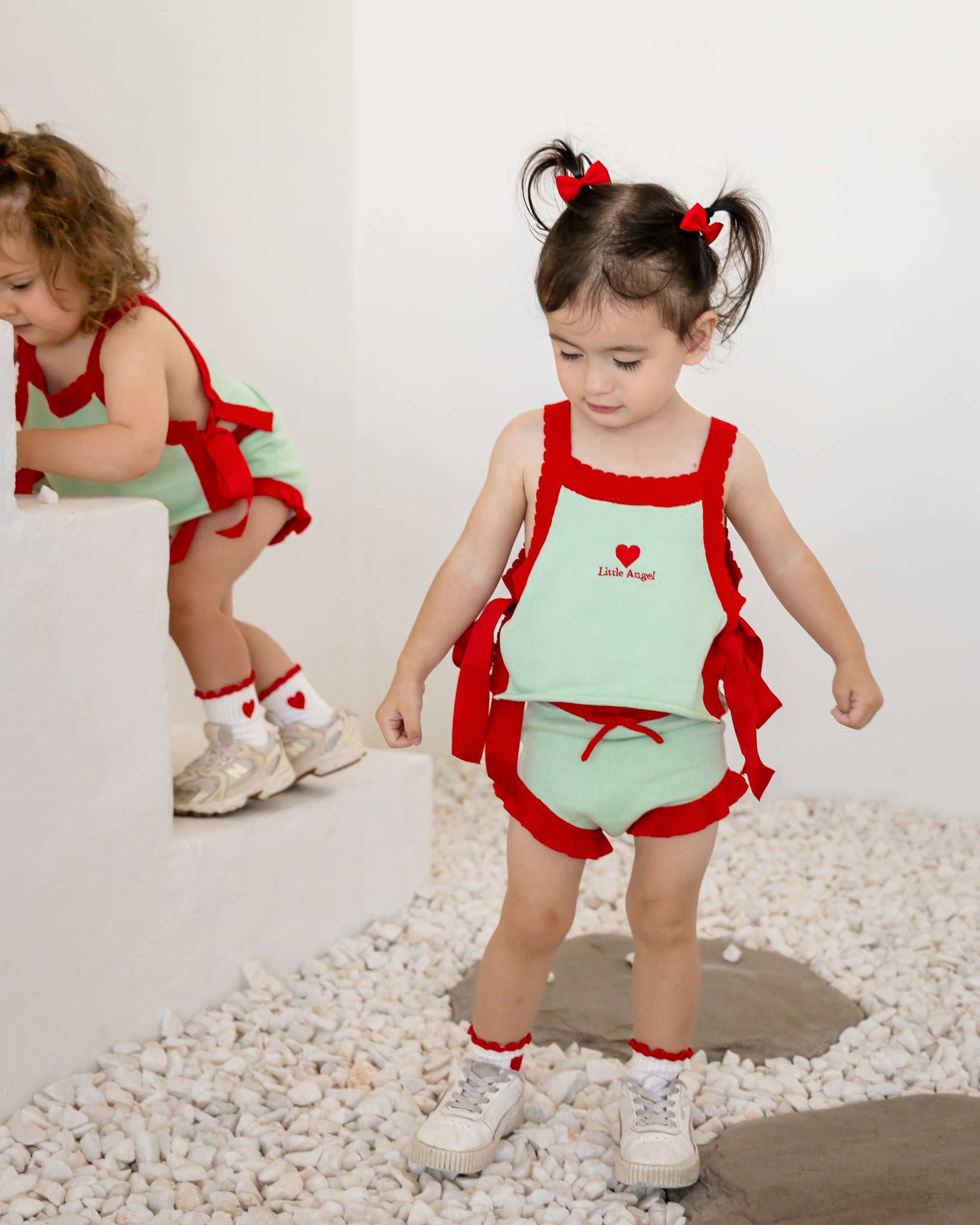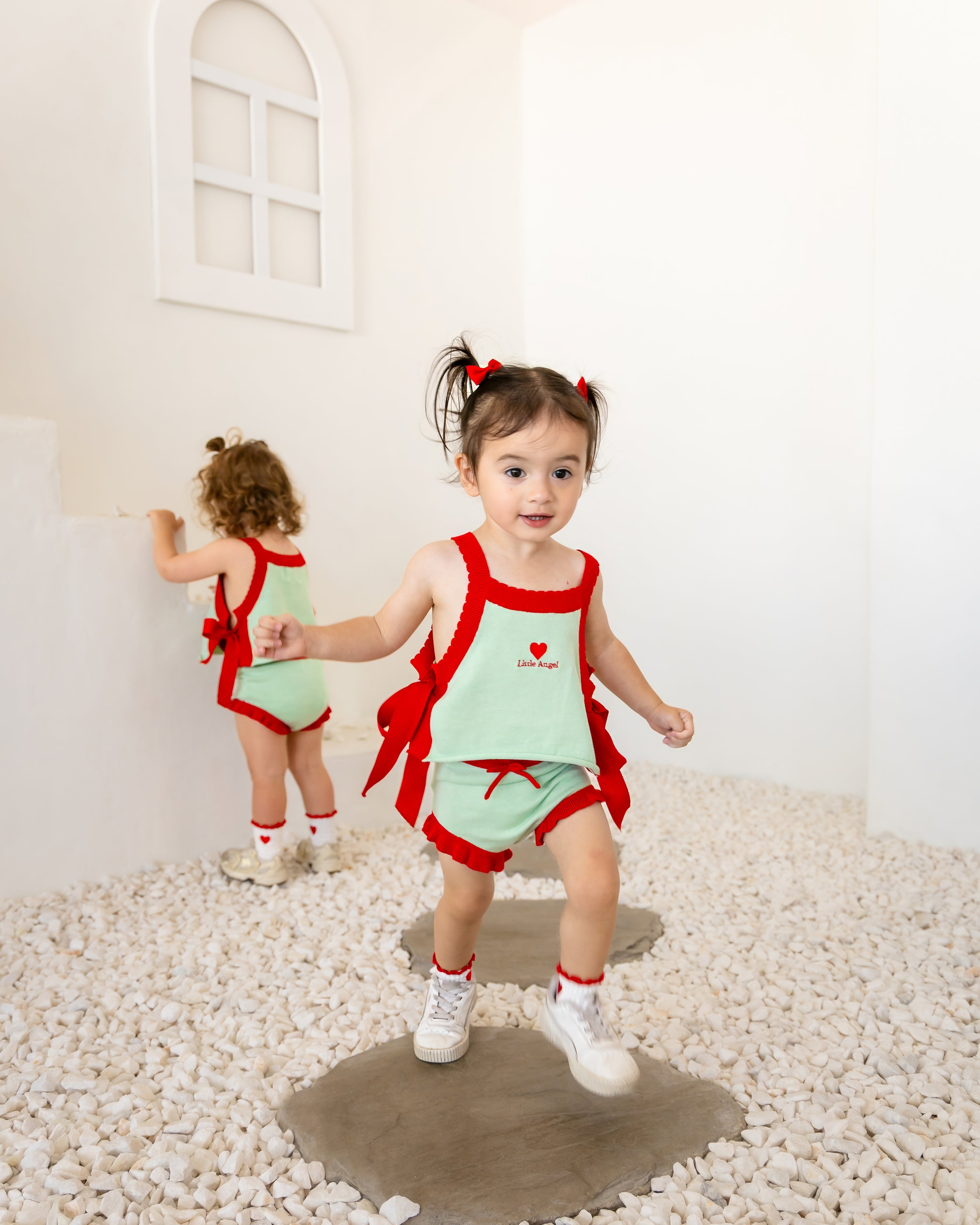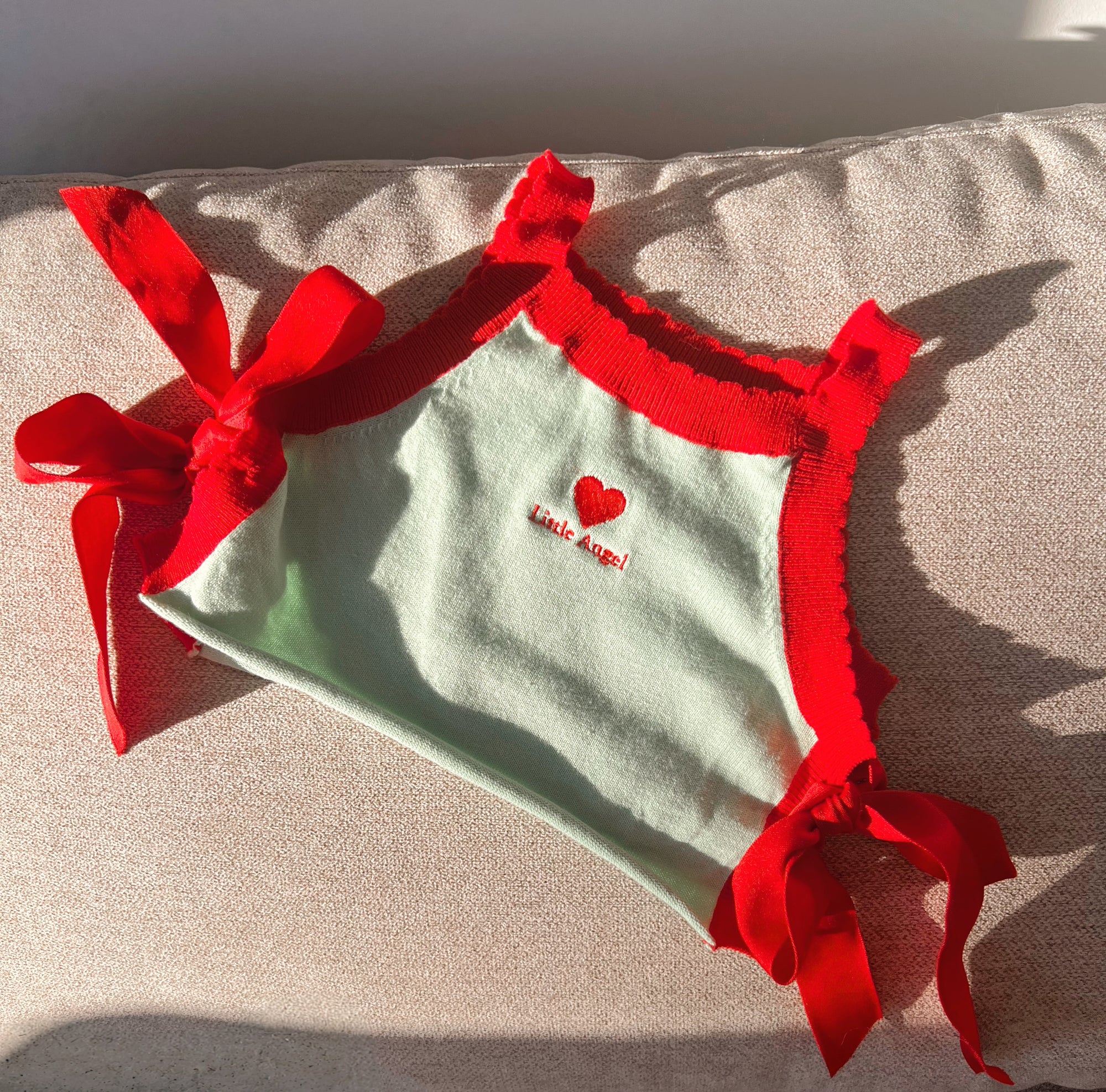 Soft, nostalgic and beautifully detailed, our Little Angel Vest is crafted from pure cotton. She's trimmed with scalloped red edges and finished with satin bow ties at each side for that extra angelic charm. A bold red heart and Little Angel embroidery add a sweet statement on top of the mint base. Completed with a rolled edge at the waist for extra texture, she's made for little loves with big hearts.