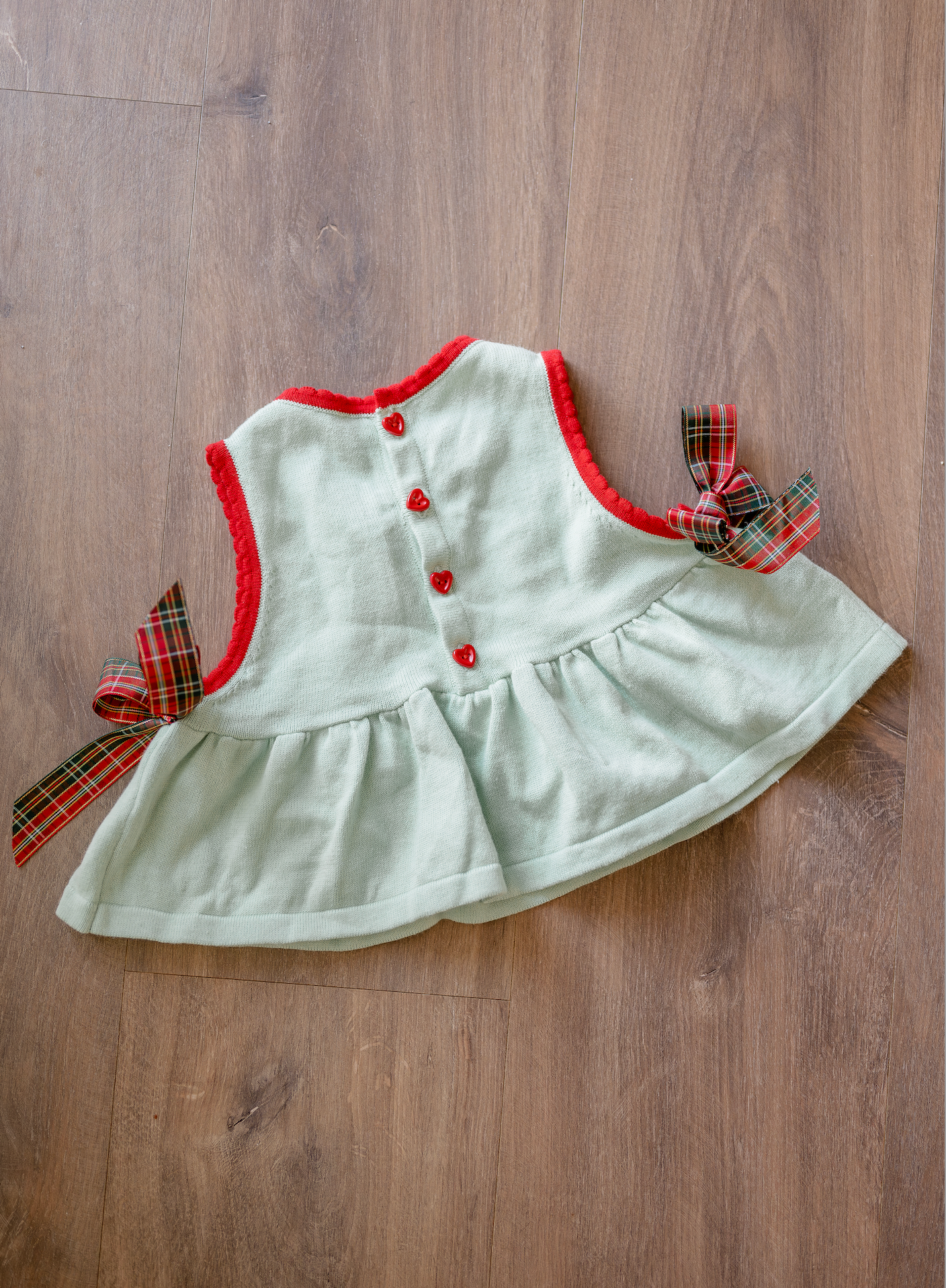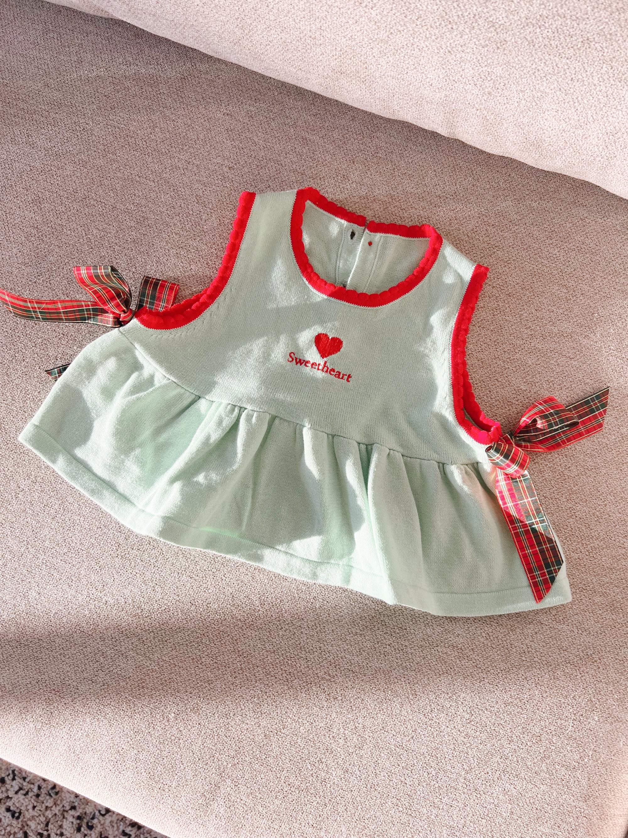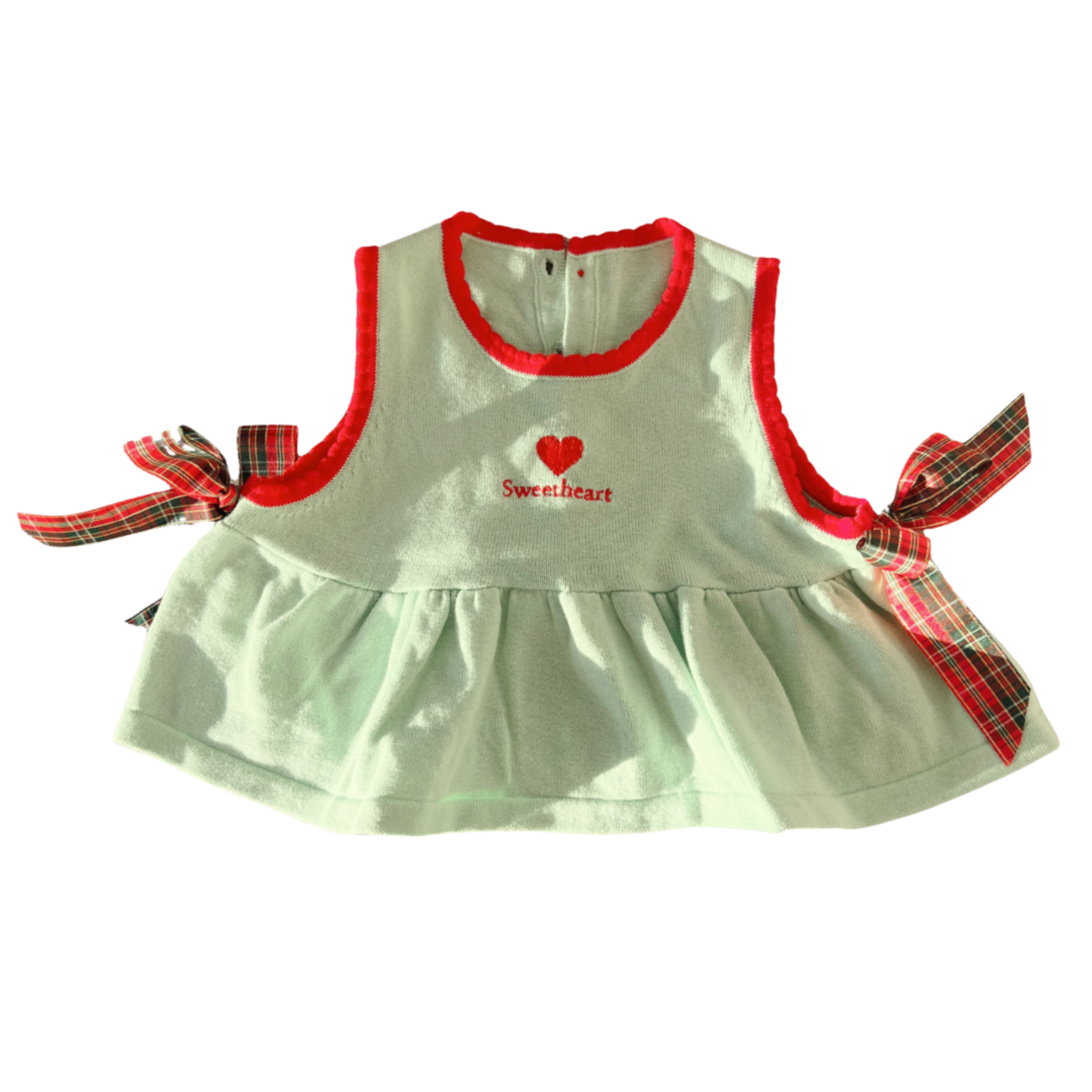 Our Sweetheart Peplum is as cute as can be. Crafted from 100% cotton, she features vibrant red scallop-edged trims and tartan bow details at each side for a charming pop of contrast. An embroidered red heart and Sweetheart lettering adorn the front, adding the sweetest finishing touch. Beautiful red heart buttons trail down the back, and her airy peplum silhouette adds soft, playful movement.