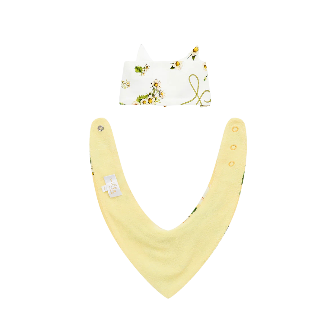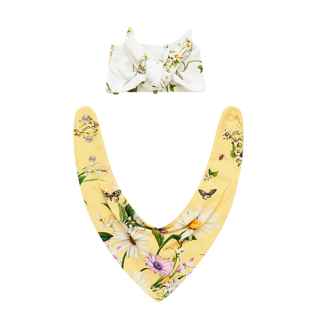 Designed in Australia, the Daisy Chains Babies Headband With Fastener And Bib Set celebrates golden fields and sunlit days. Daisies and multi botanicals weave through textiles, lace and tapestries, telling a story of carefree wonder. Lovingly handcrafted from breathable cotton, this headband and bib set features a soft feel, adjustable silhouettes, a wide band and the convenience of soft velcro fastening details