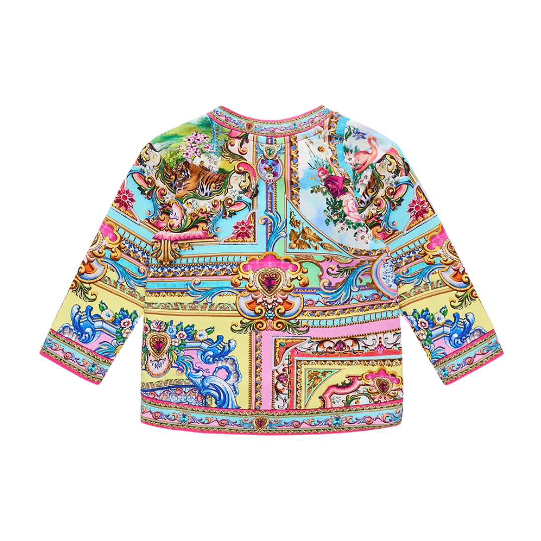 Designed in Australia, the Spirit Of Santa Maria Babies Sweater dances in pastel hues and vibrant painterly graphics, inspired by the electric beauty of Igreja Matriz De Santa Maria and its radiant frescoes. Lovingly handcrafted, this luxury kids jumper is crafted in the softest organic cotton fleece, full length sleeves finished with contrast cuffs ensure lavishly adorable coverage for your little one.