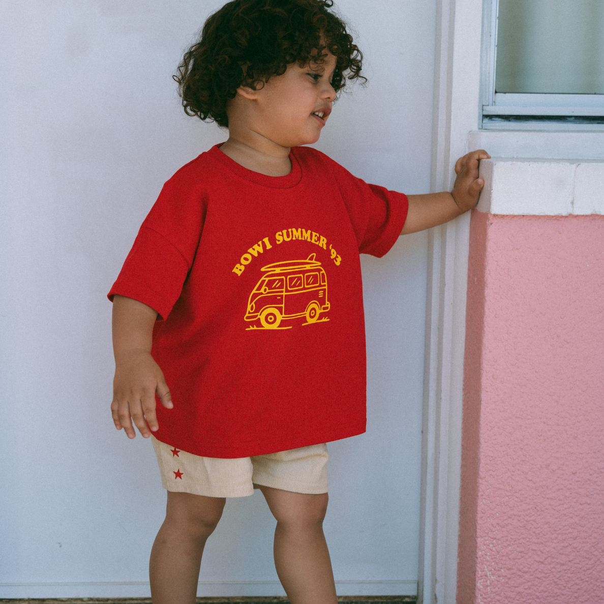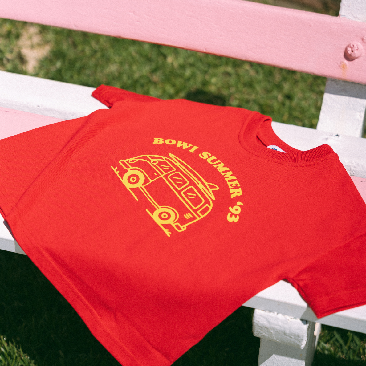 This vibrant red t-shirt features a retro camper van graphic with “Bowi Summer ’93” across the chest. Made from 100% cotton with a soft, stretchy neckline for easy changes, it’s perfect for beach trips, road trips, and backyard hangs.