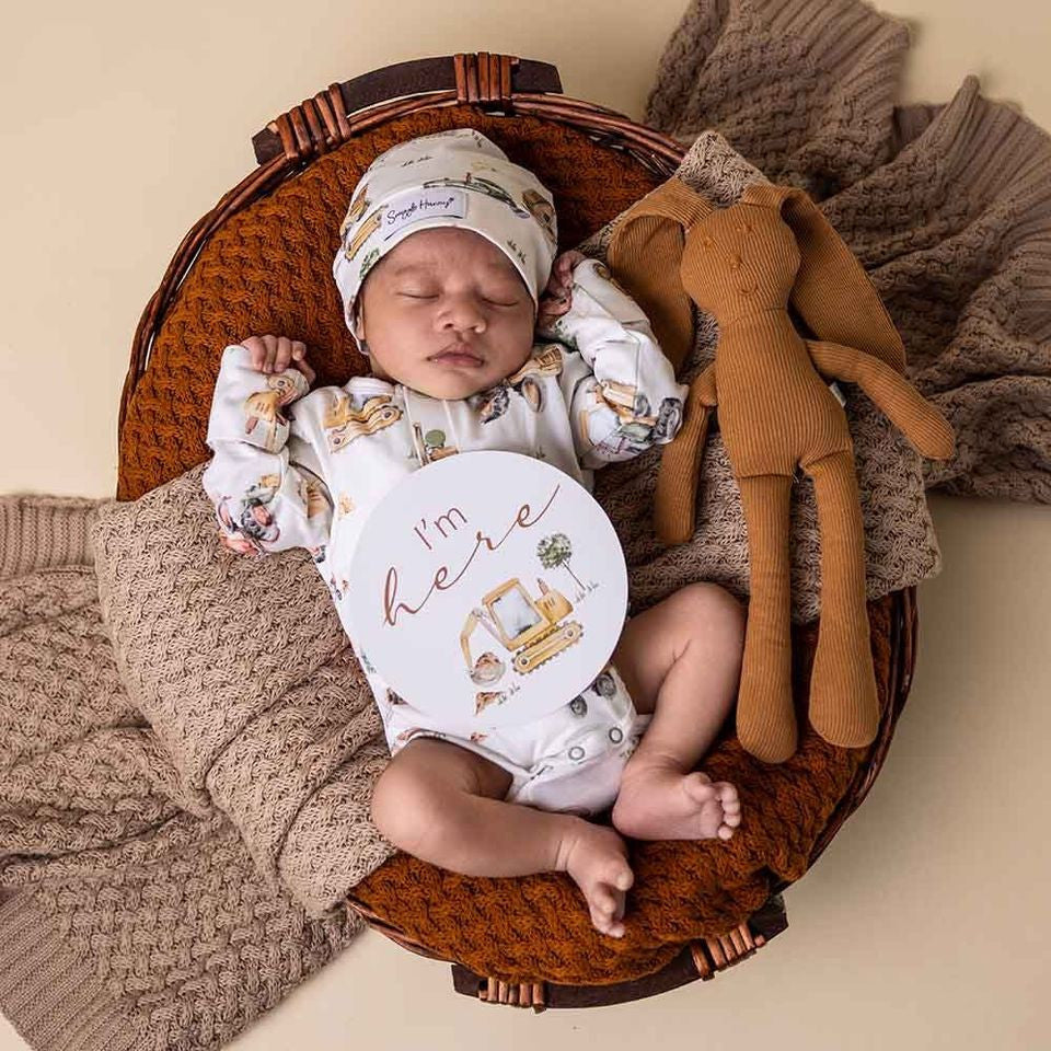 Soft and stretchy, our bodysuits are easy-care and coordinate well with our pants and shorts. This Diggers bodysuit matches beautifully with our Biscuit and Pebble rib.