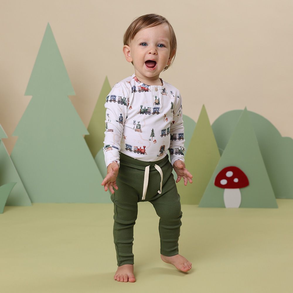 Soft and stretchy, our bodysuits are easy-care and coordinate well with our pants and shorts. Trains is part of our Enchanted Forest collection.
