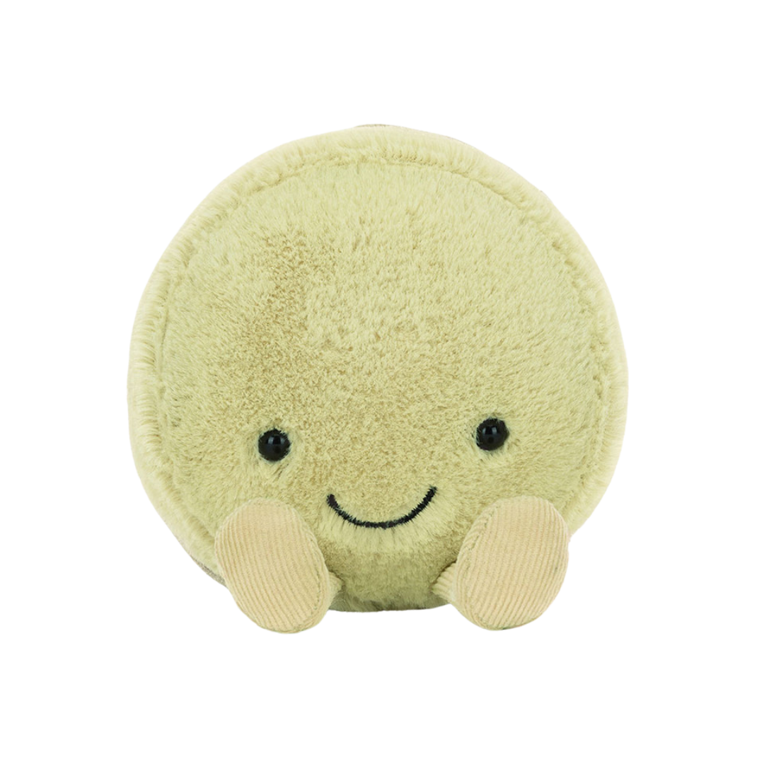Amuseables Max Macaron is soft and sweet in green fur. With matching cordy feet, a big, stitched smile, and a velvety middle, Max has an embroidered Jellycat logo on the back for a truly luxurious treat!