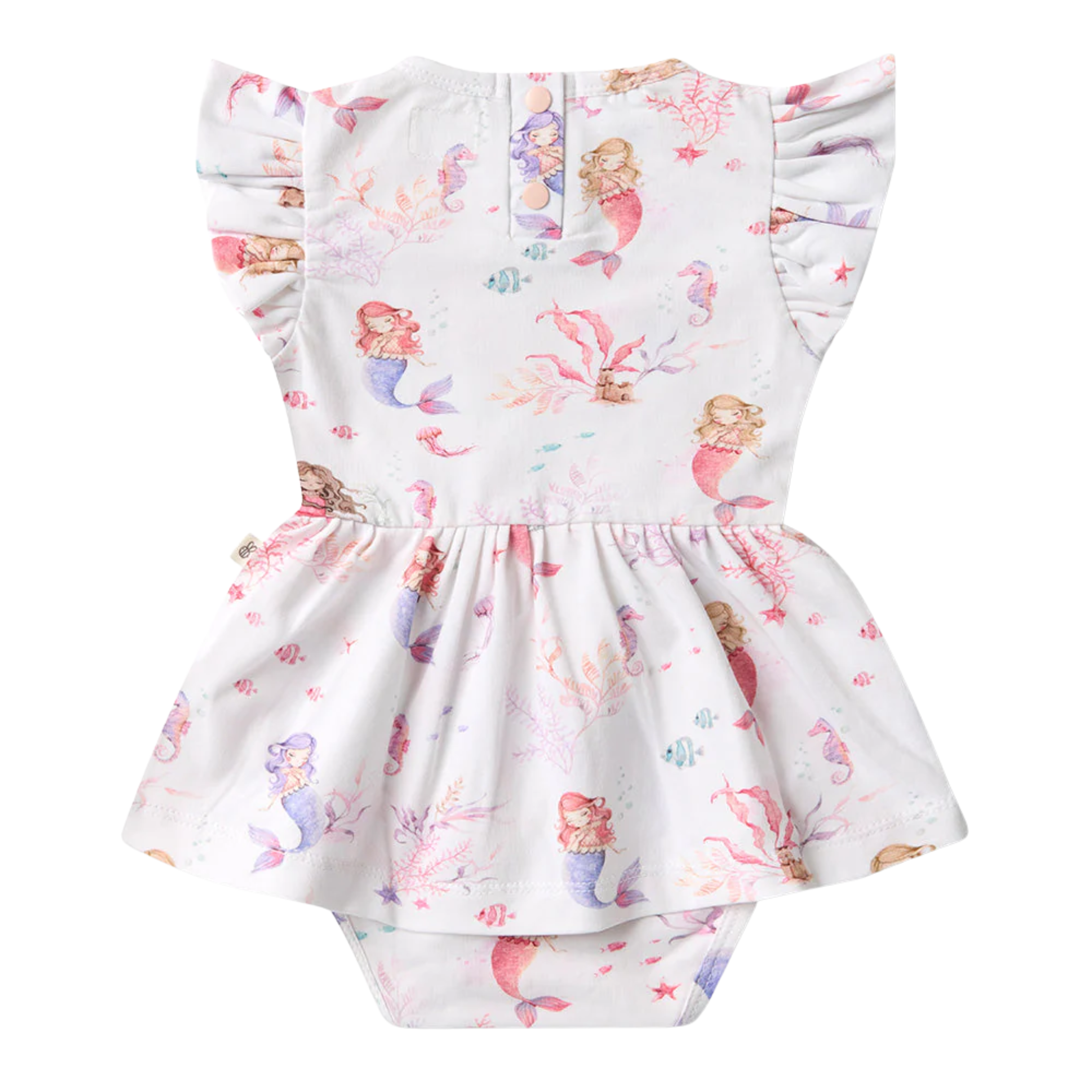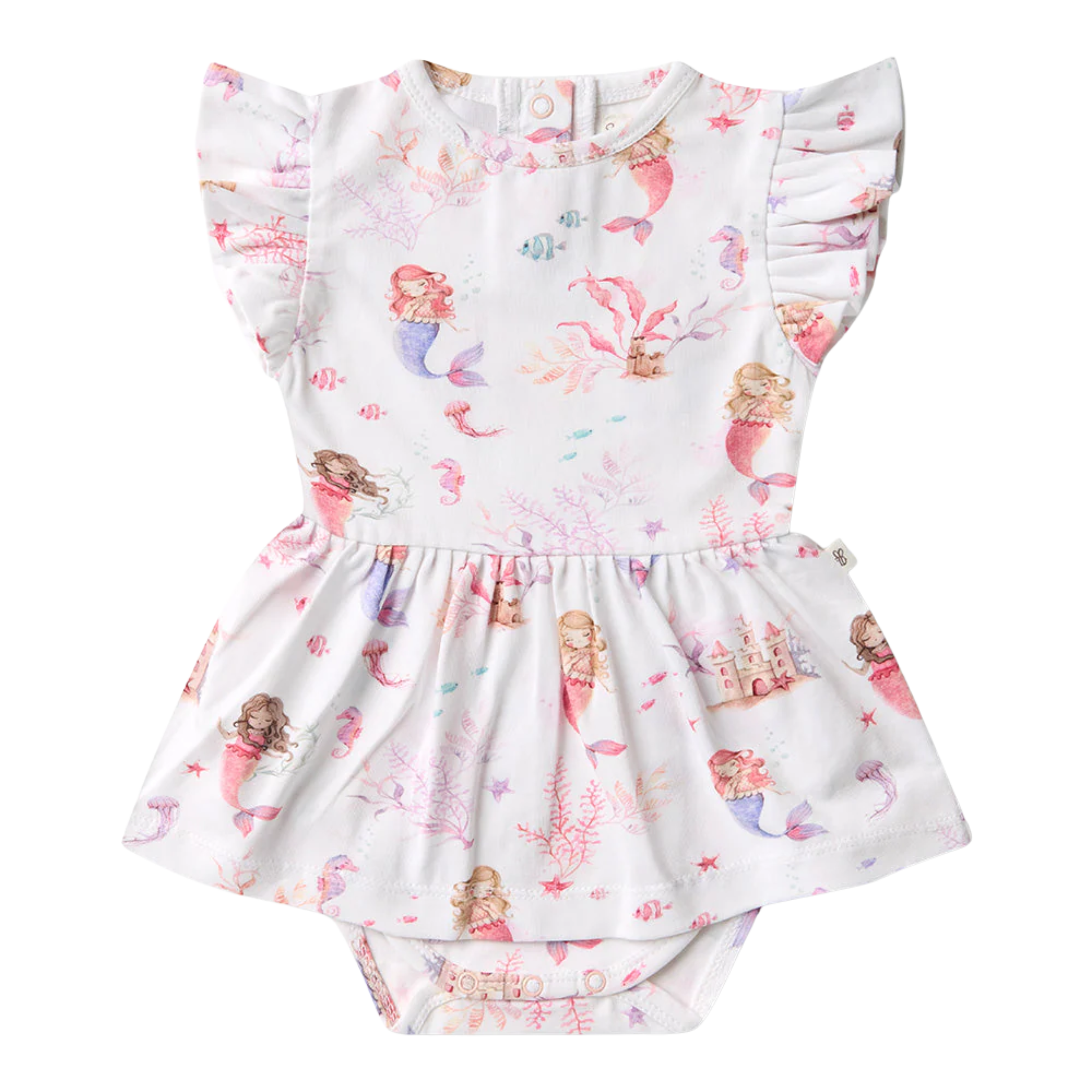 Soft and stretchy, our dresses are easy-care and very comfy for bub. The sizes up to and including size 1 come with a snap underbody to go over a nappy. Size 2 and up doesn't have the snap body feature. We have really focused on the details and ensured the dresses up to size 1 are short enough so that a baby can crawl and not trip over the skirt. Size 2 and over, when they're walking, is a bit longer.