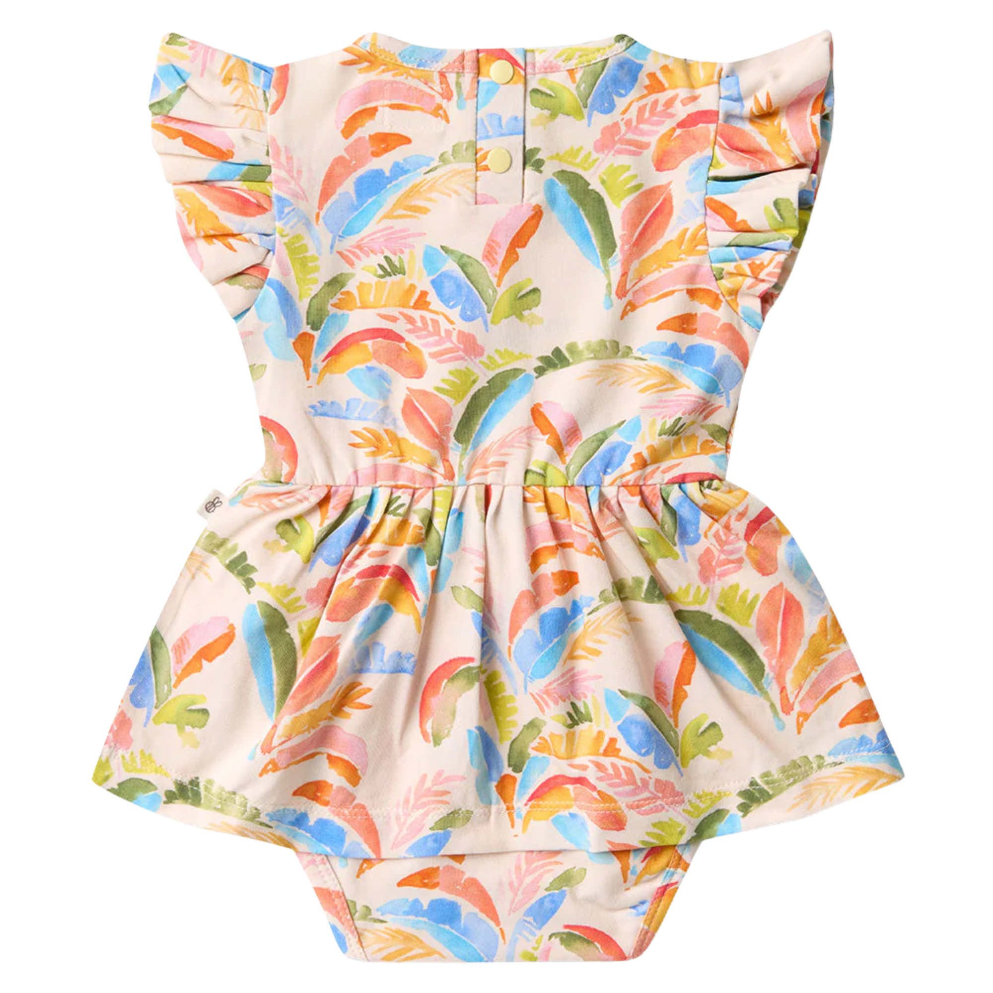 Soft and stretchy, our dresses are easy-care and very comfy for bub. The sizes up to and including size 1 come with a snap underbody to go over a nappy. Size 2 and up doesn't have the snap body feature. We have really focused on the details and ensured the dresses up to size 1 are short enough so that a baby can crawl and not trip over the skirt. Size 2 and over, when they're walking, is a bit longer.