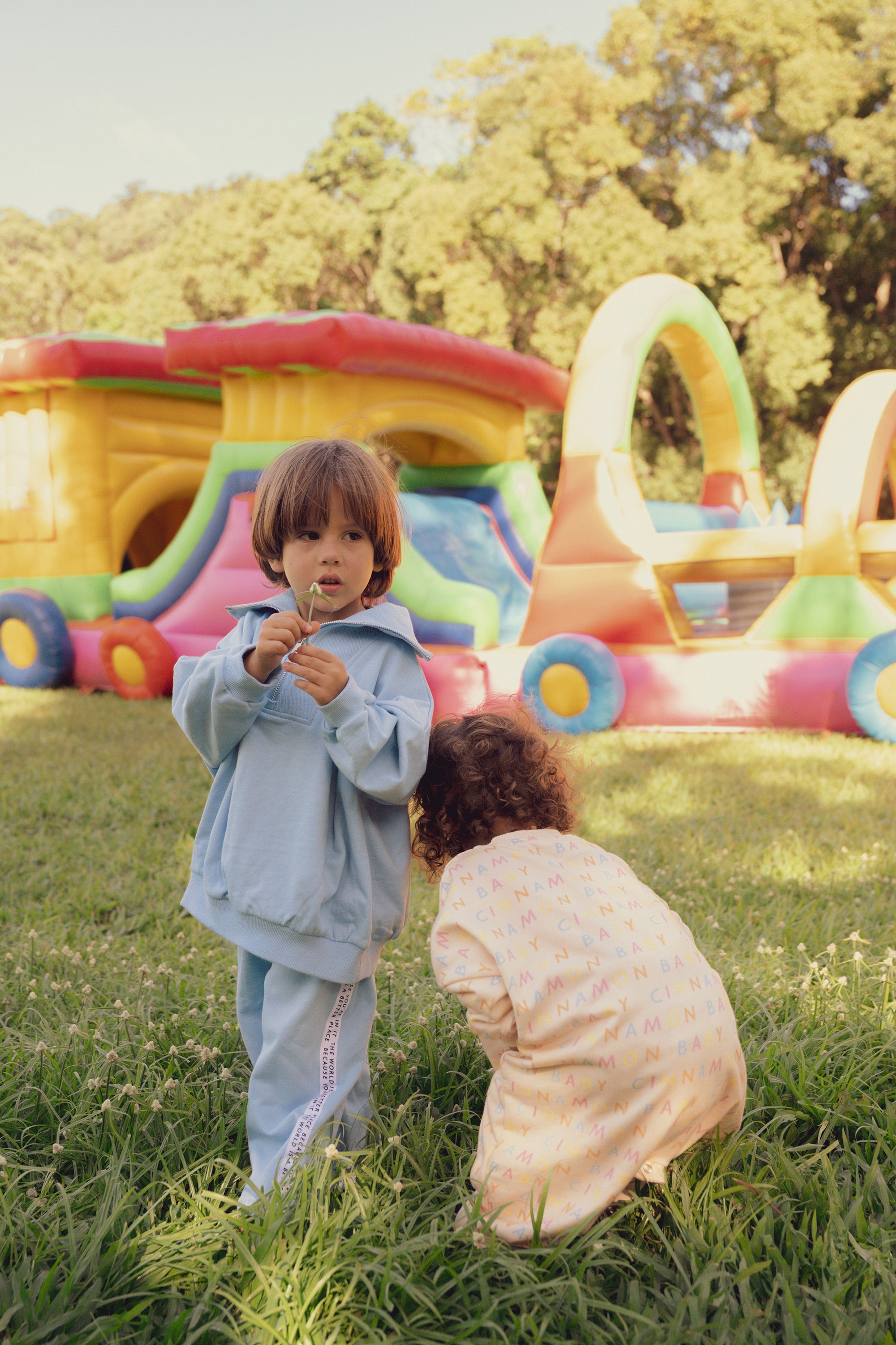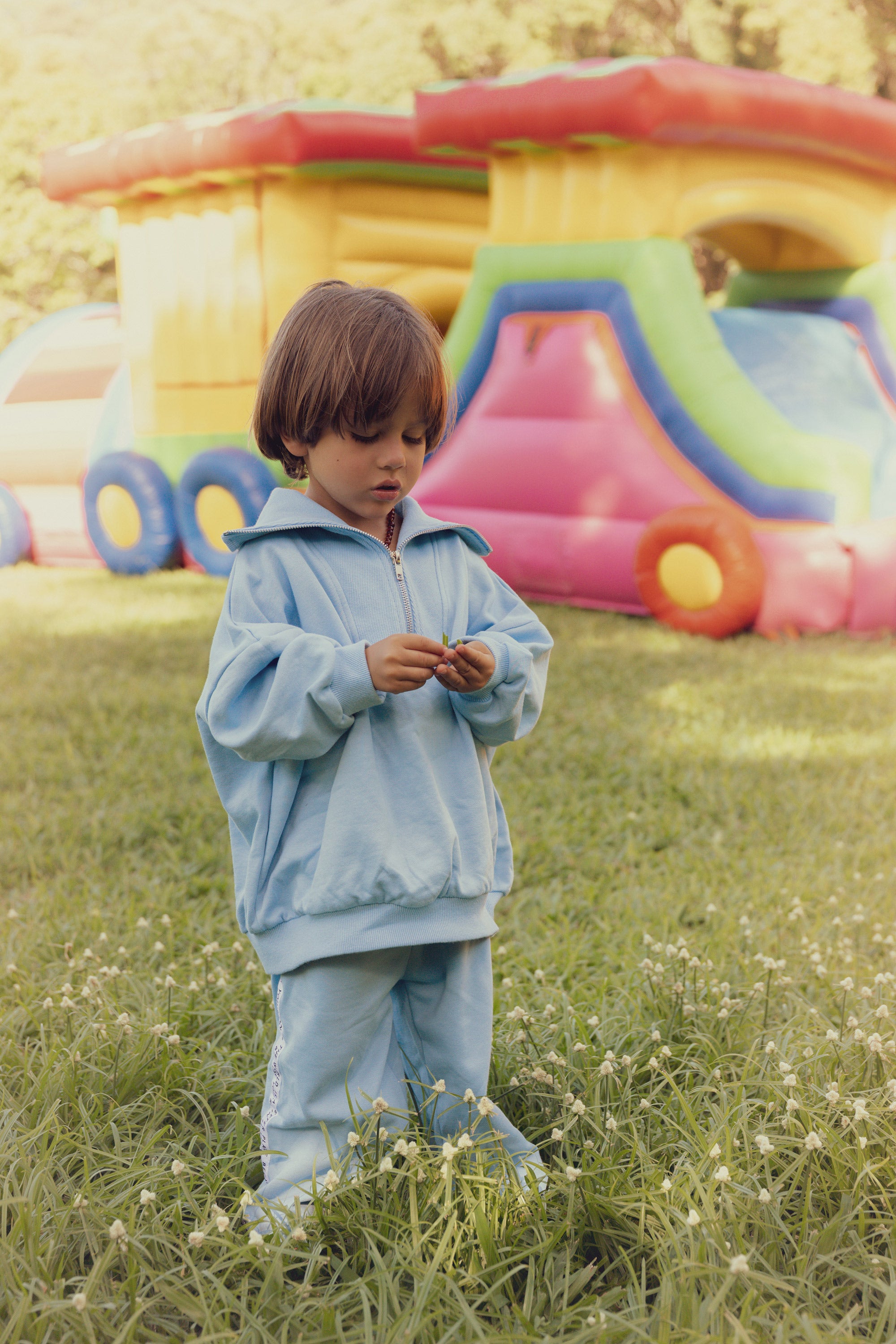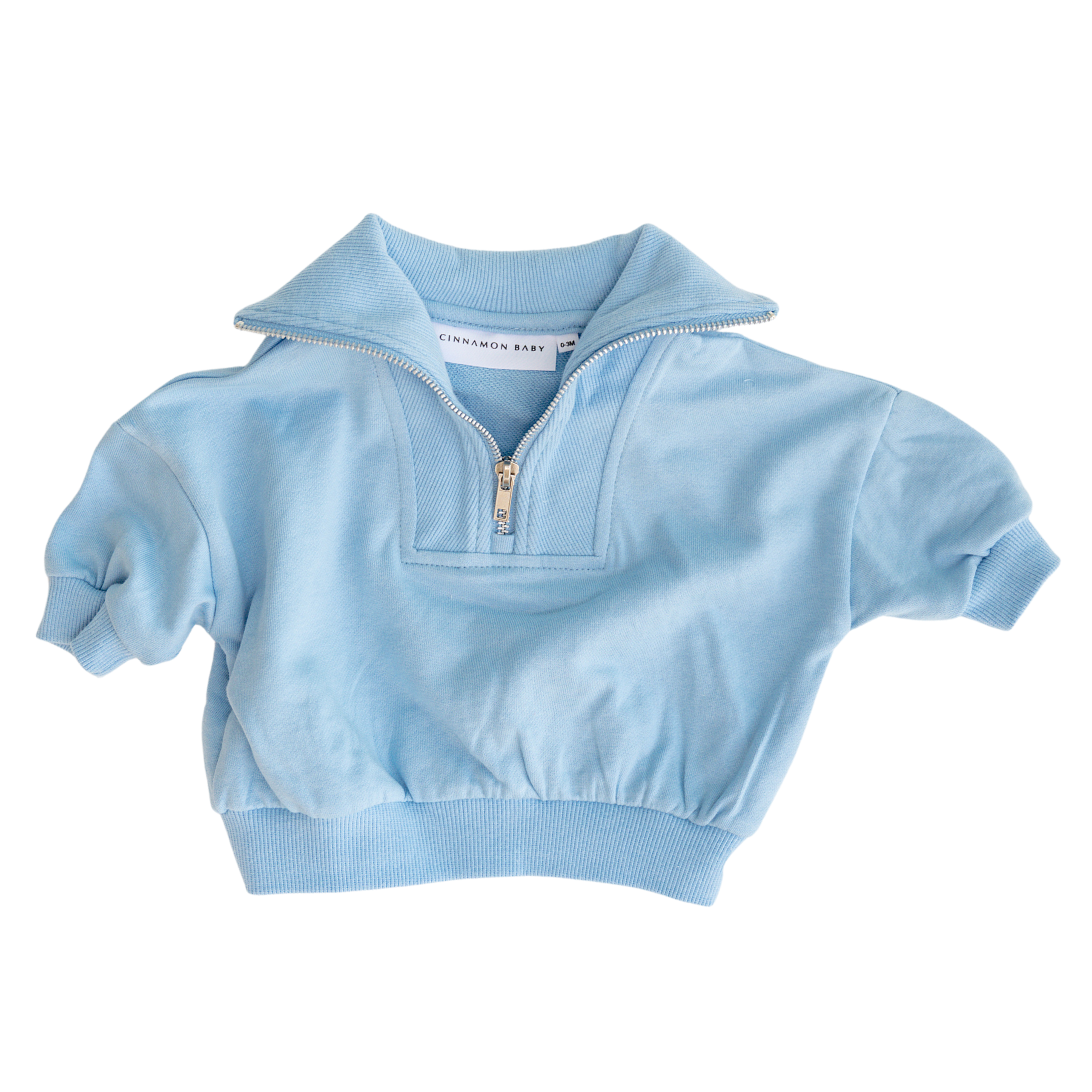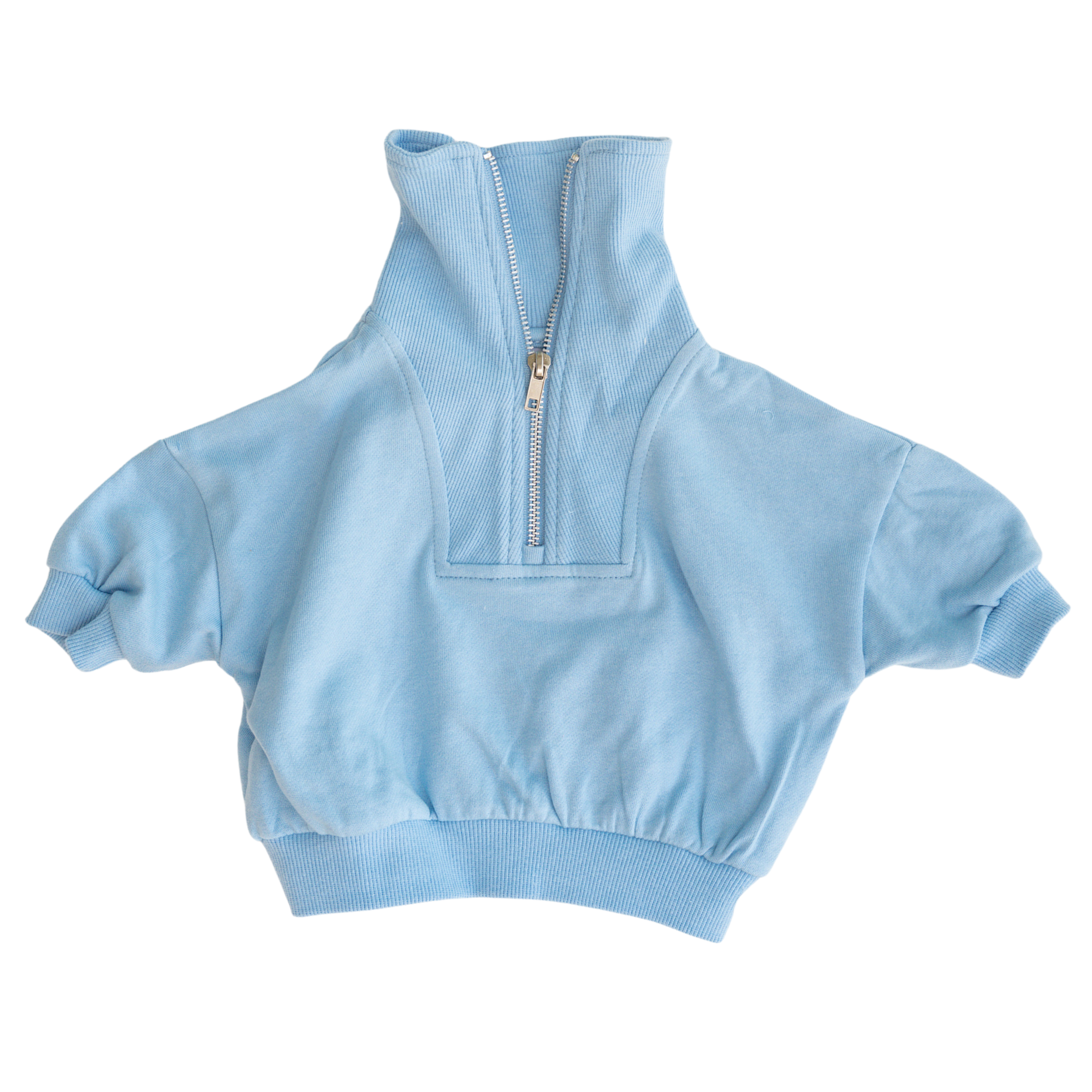A relaxed, oversized jumper in a fresh sky blue shade. Designed with a half-zip neckline and ribbed details, this piece combines comfort and perfect for layering and everyday wear.