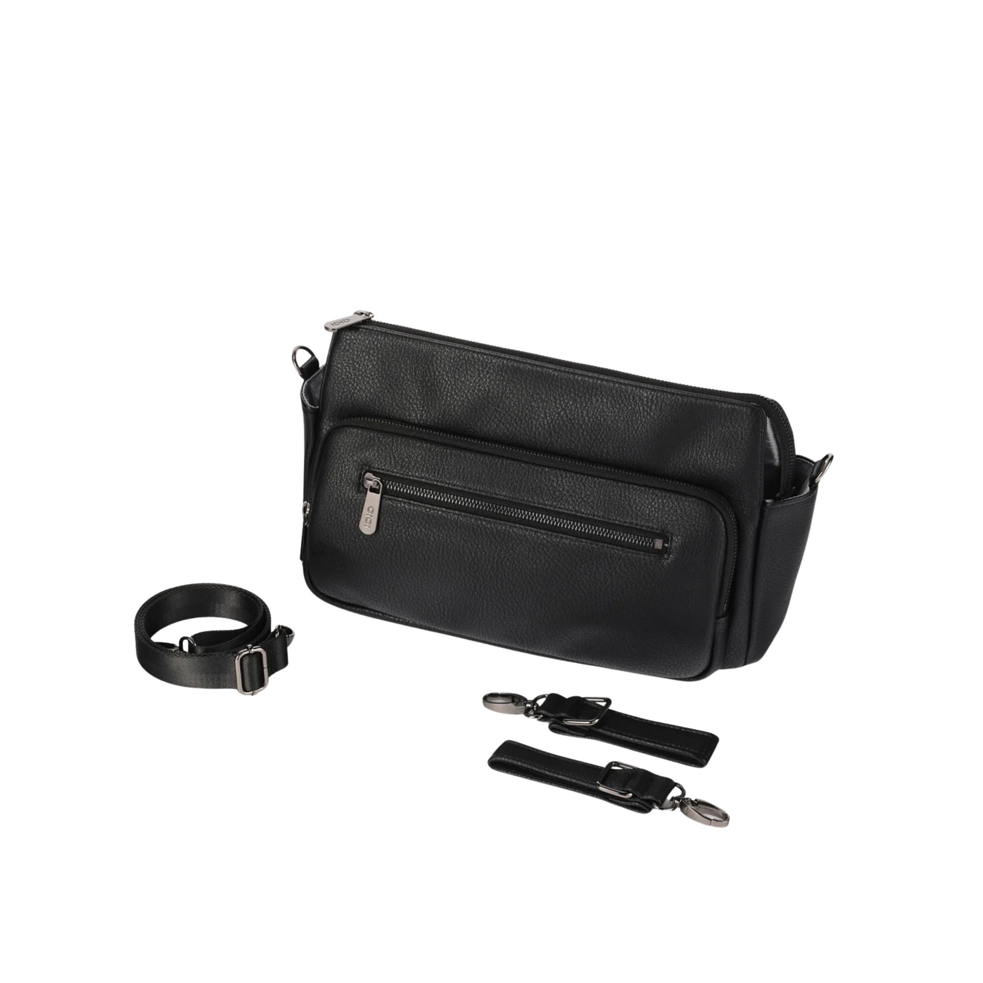• Easy to clean premium vegan leather • Water resistant lining • Spacious 6 litre capacity • Zips closed • 1 insulated bottle pocket • 2 front pockets • Strong velcro pram straps • Fits both single & double prams • Comes with a detachable cross-body strap to convert into a bag • Includes dust bag