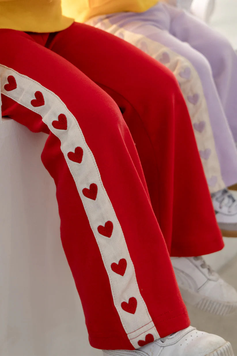 Available in Fiery Red and featuring a bold side stripe finished with embroidered hand-drawn hearts for that extra-unique touch.