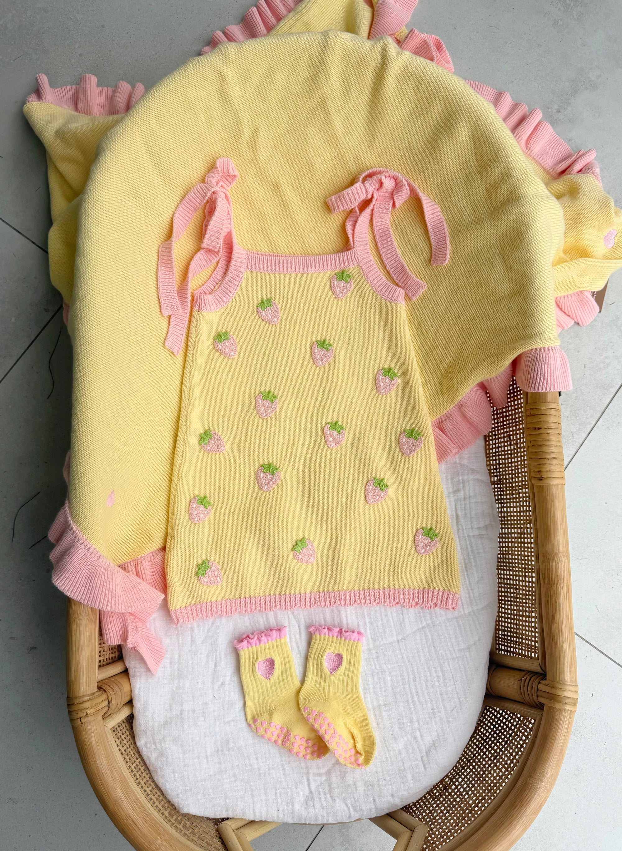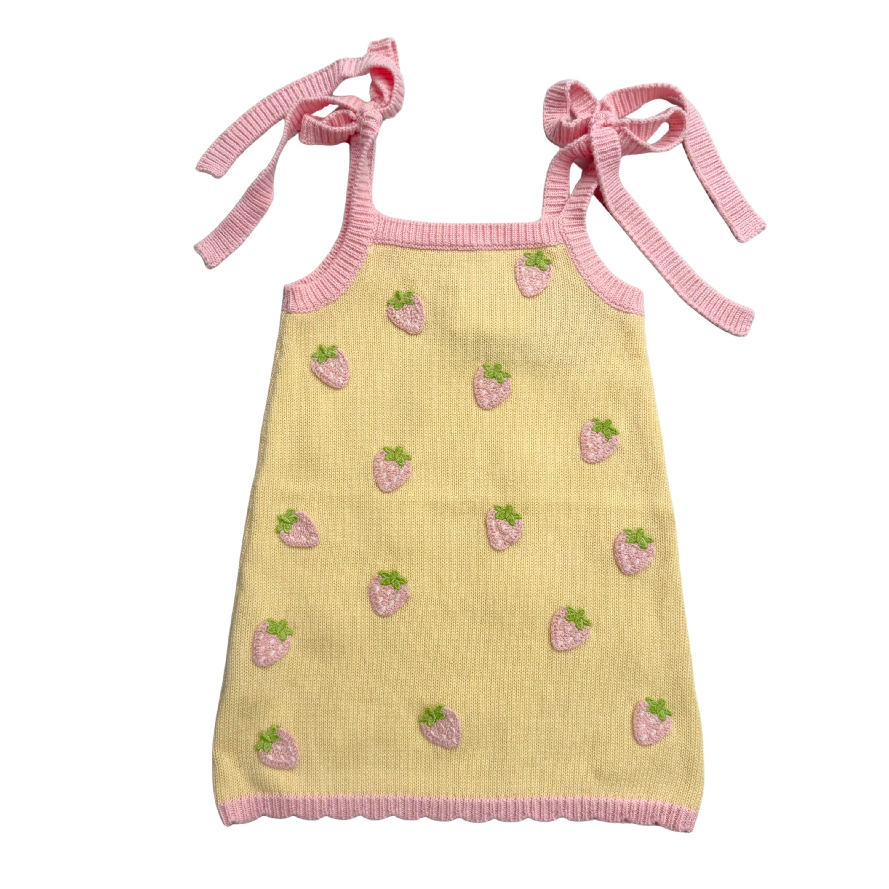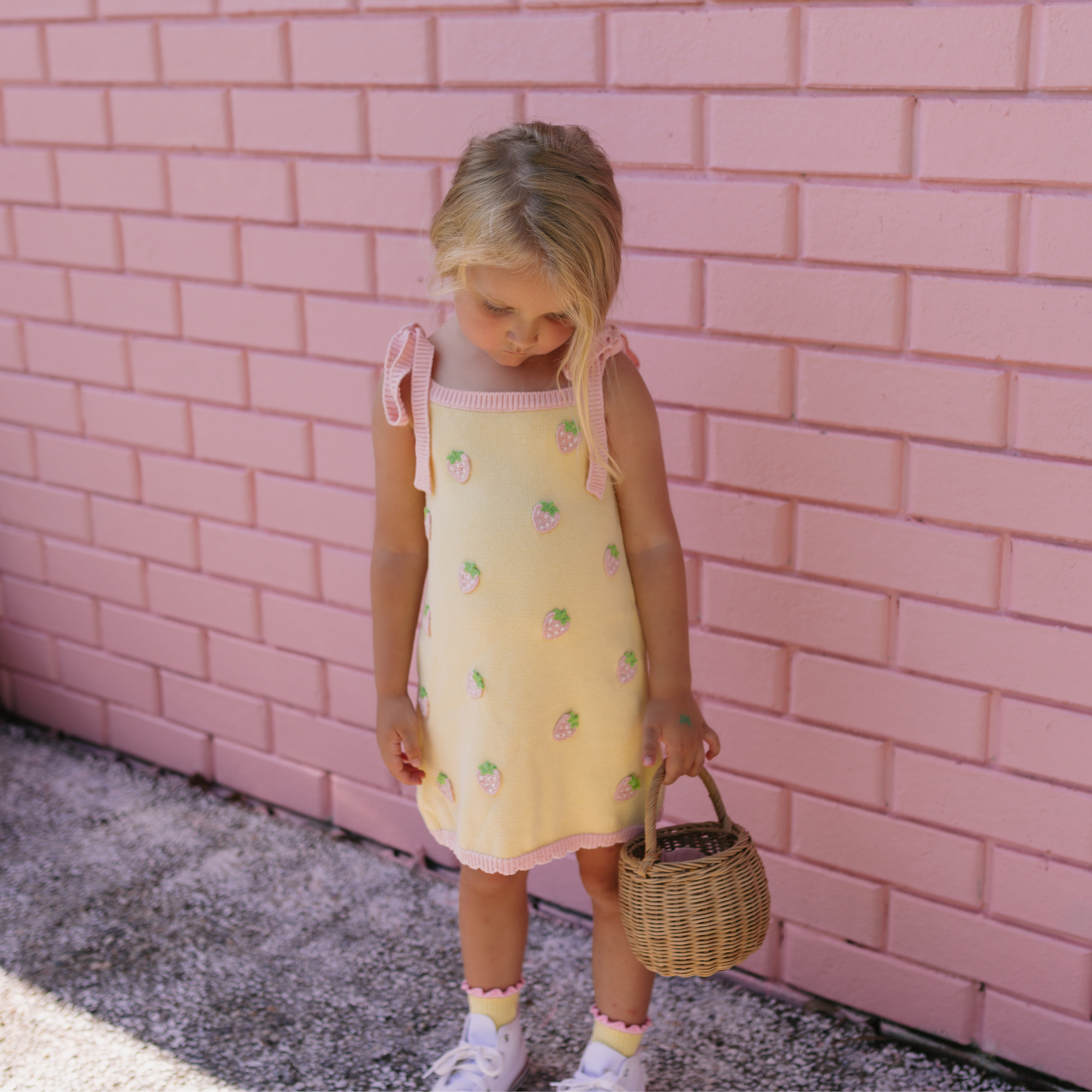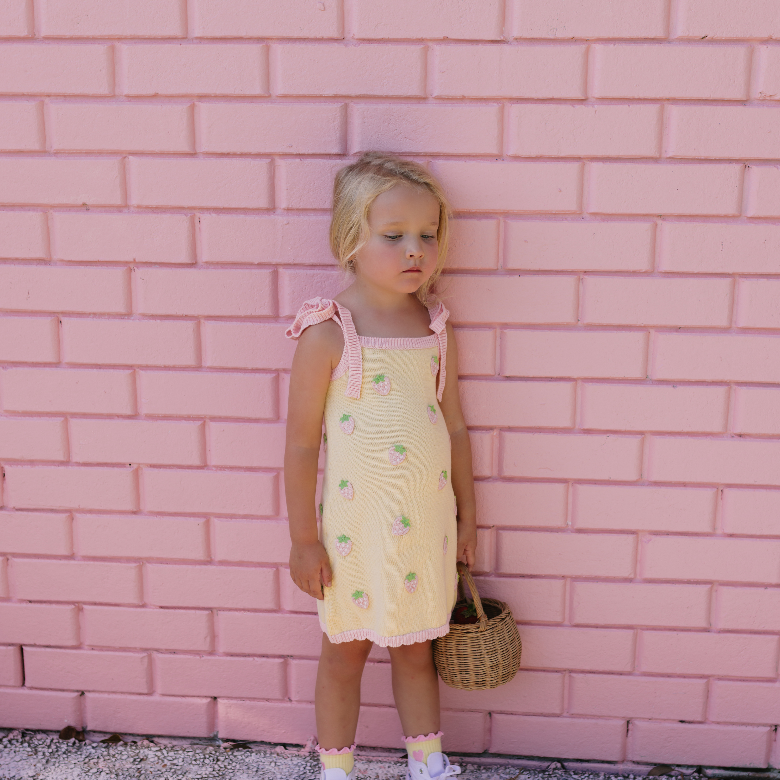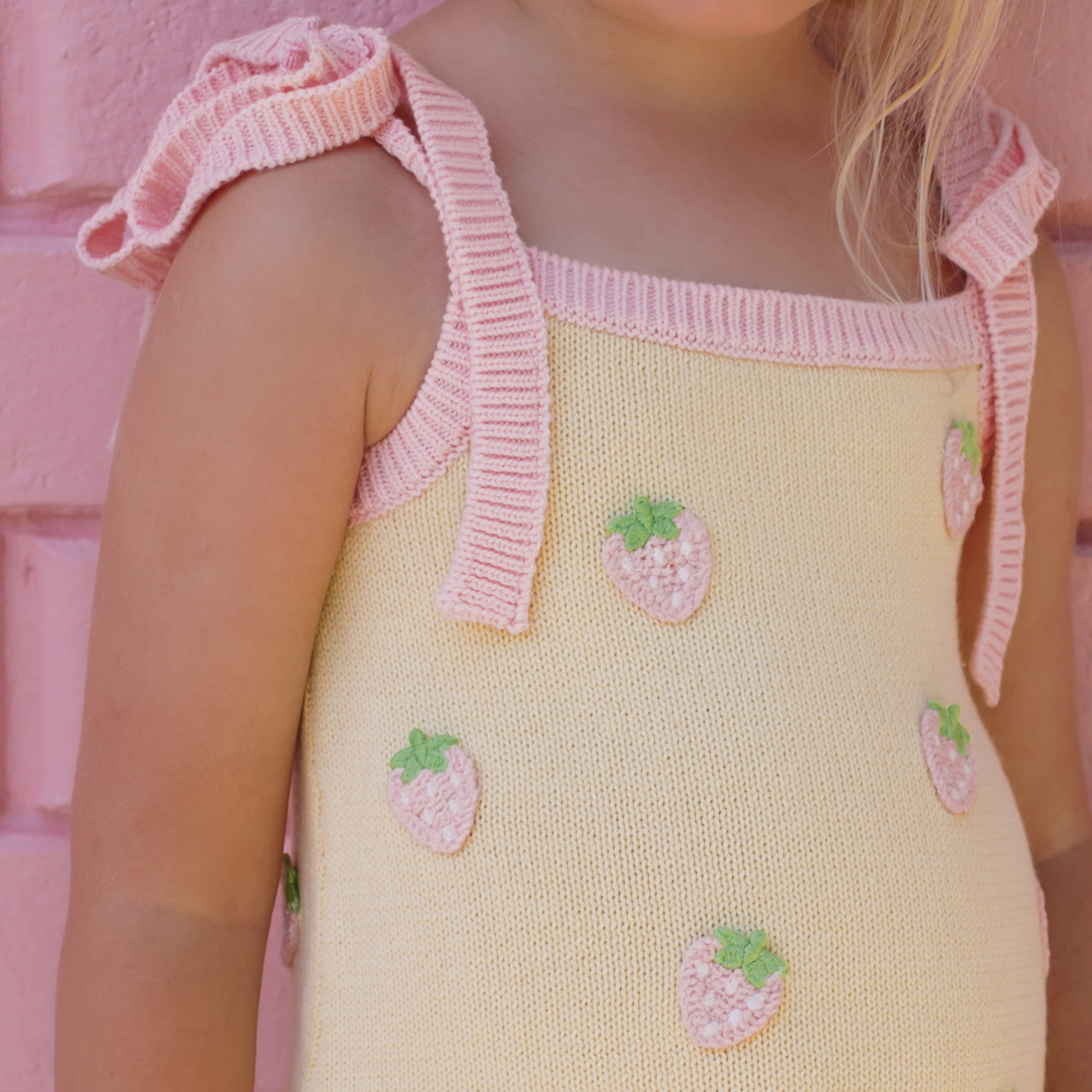 Our newFlorence Tie Dress is adorned with hand-picked strawberry appliqué and finished with delicate scalloped edging along the hem for an extra-special touch.Designed with ribbed cotton shoulder ties, it’s made to adjust and grow with your little one.