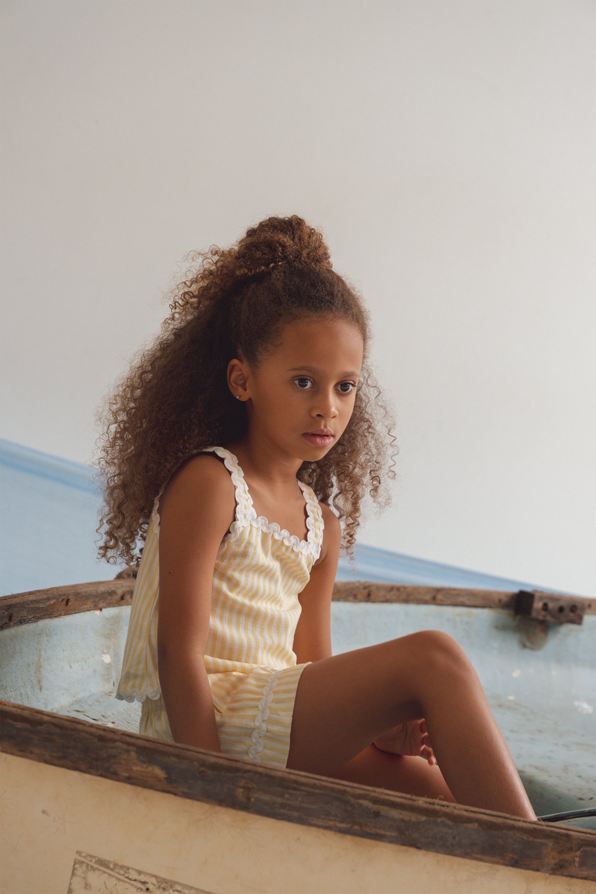 A lightweight, sleeveless top in cheerful lemon stripes, finished with a soft scalloped hem. Designed for comfort and charm, it pairs perfectly with the matching shorts.