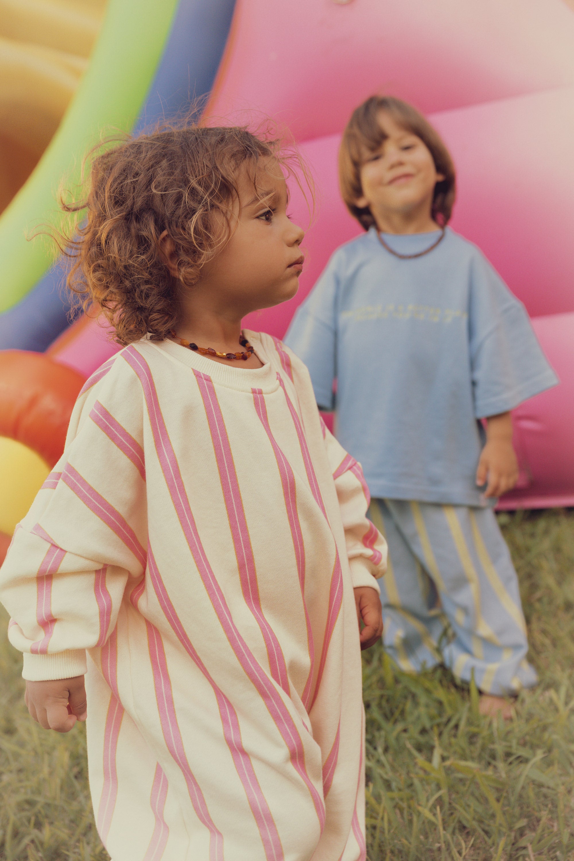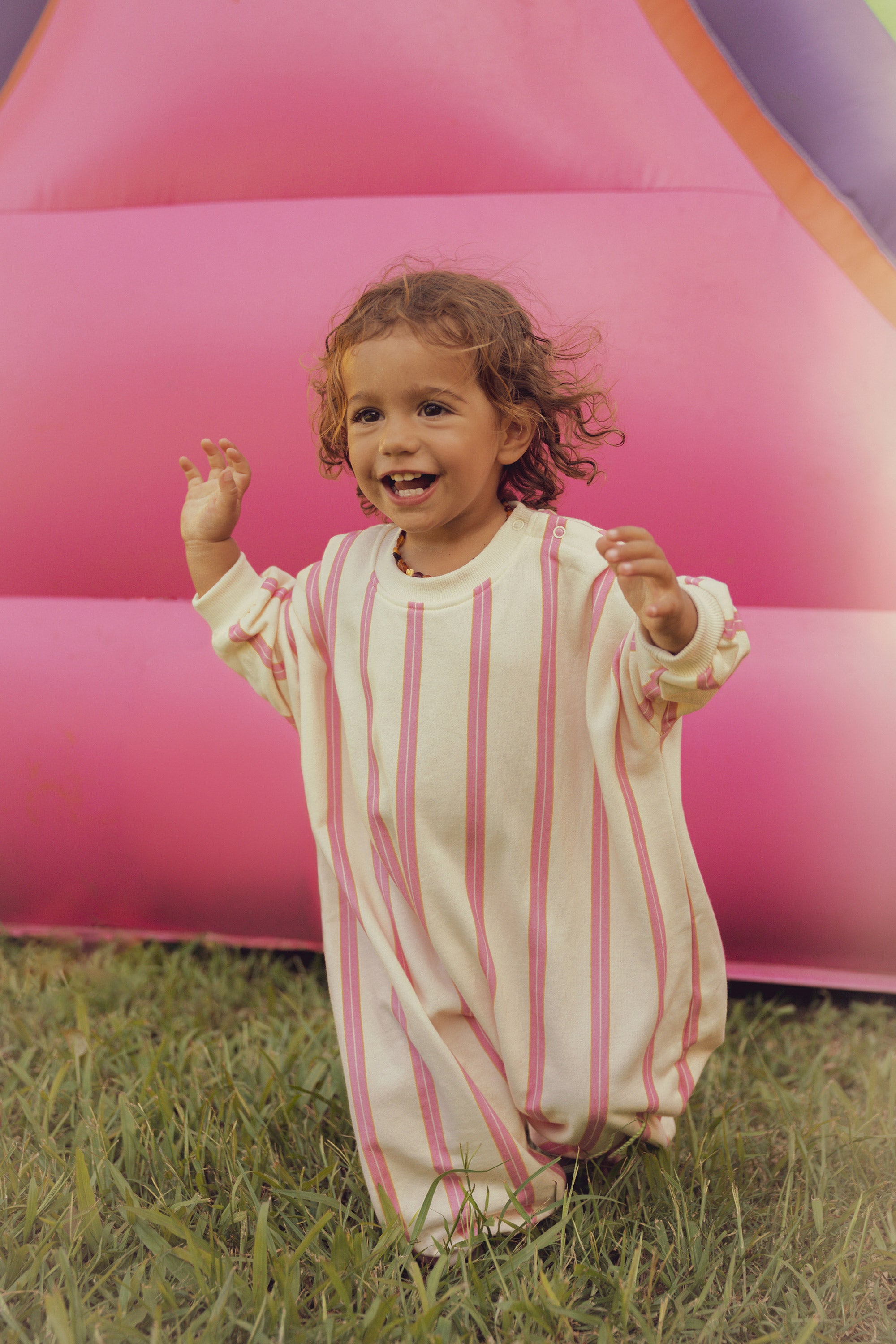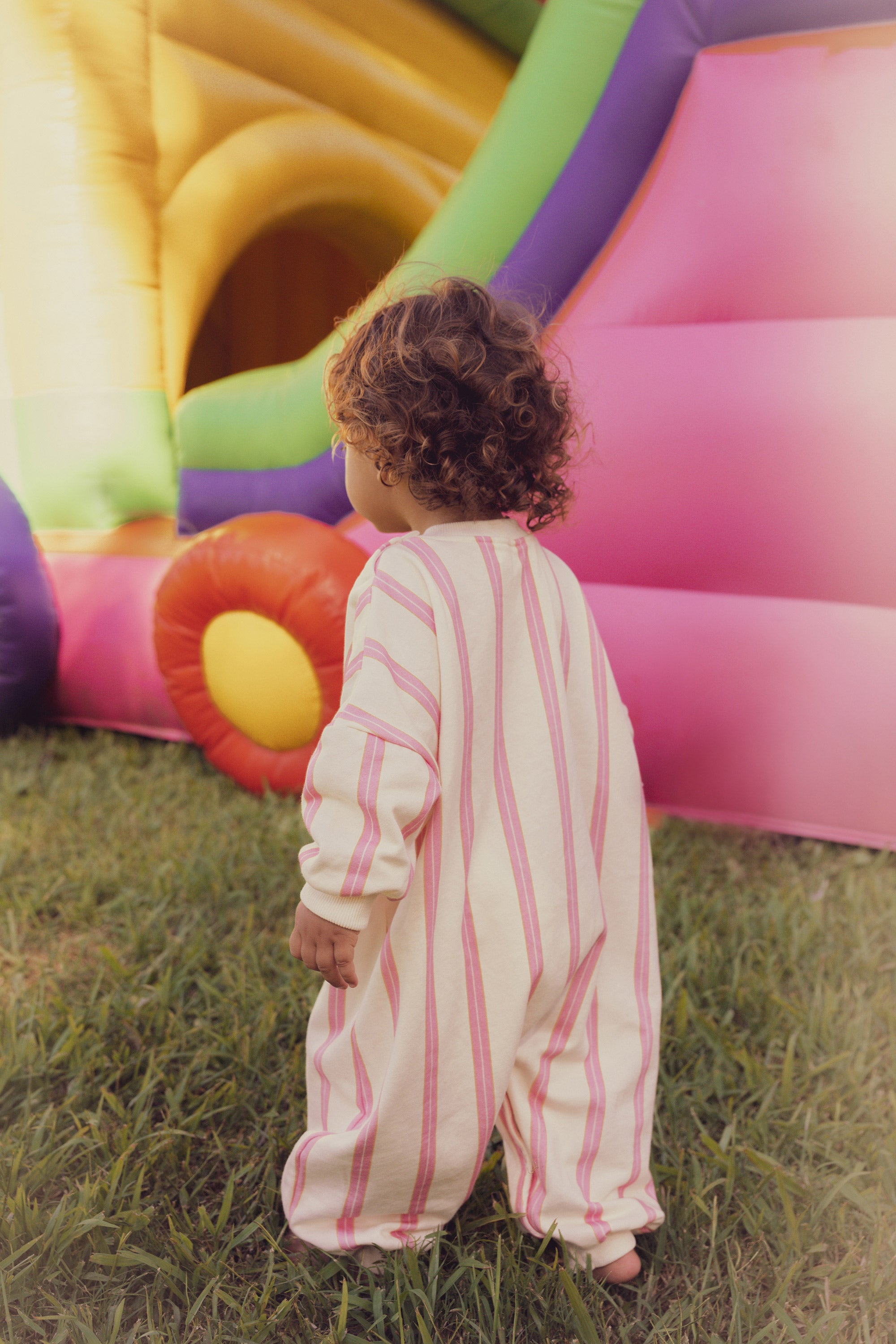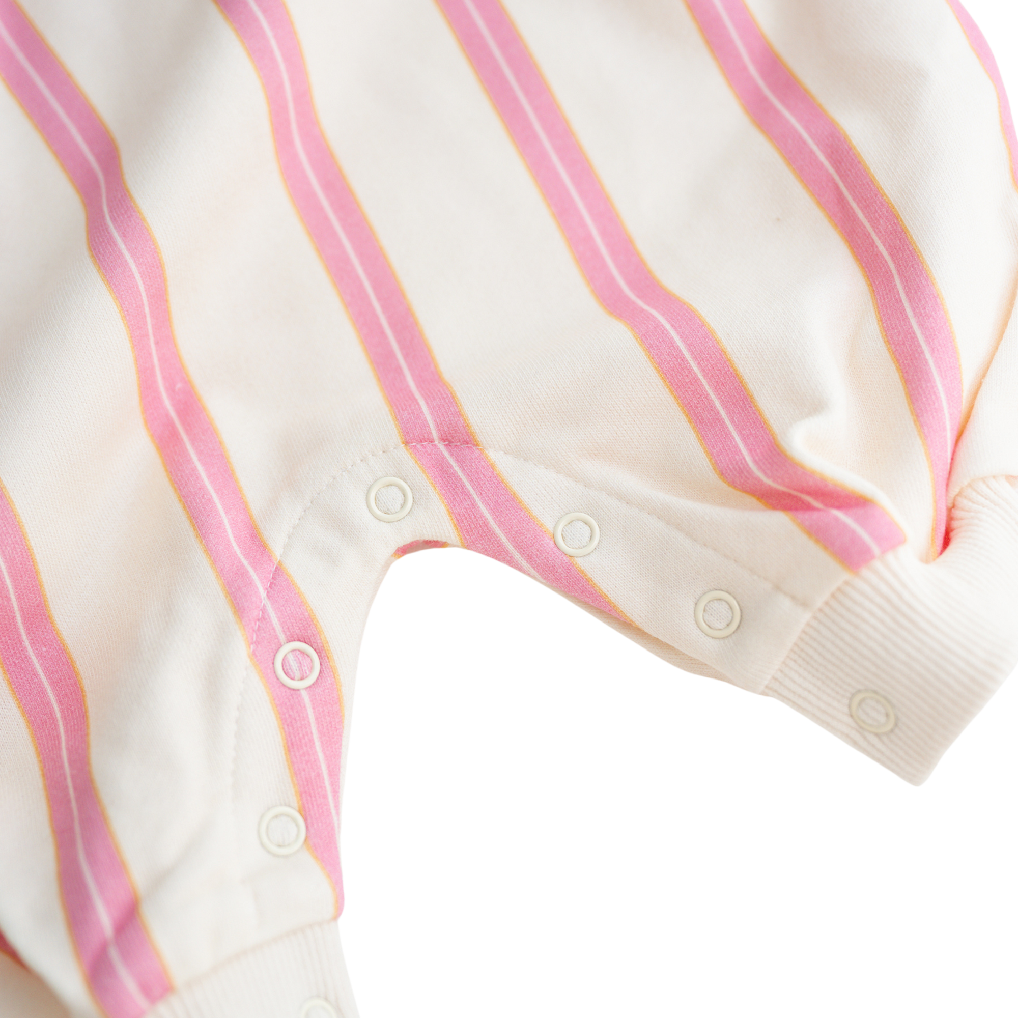 A soft and cozy lounge essential with a charming striped design. Featuring beige and bubblegum pink prism stripes, this suit offers a comfortable fit and practical snap buttons for convenience. Ideal for everyday wear and relaxed moments.