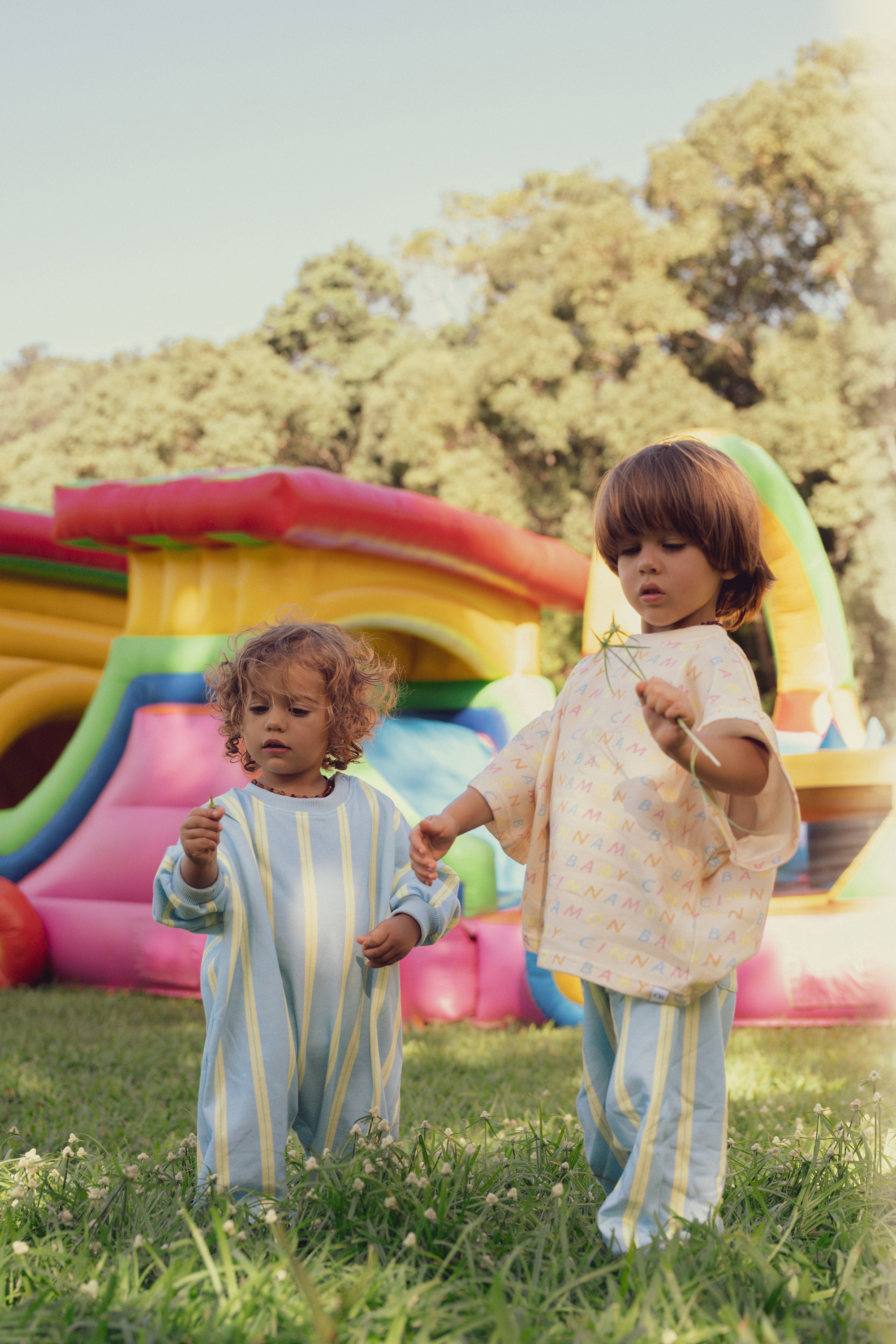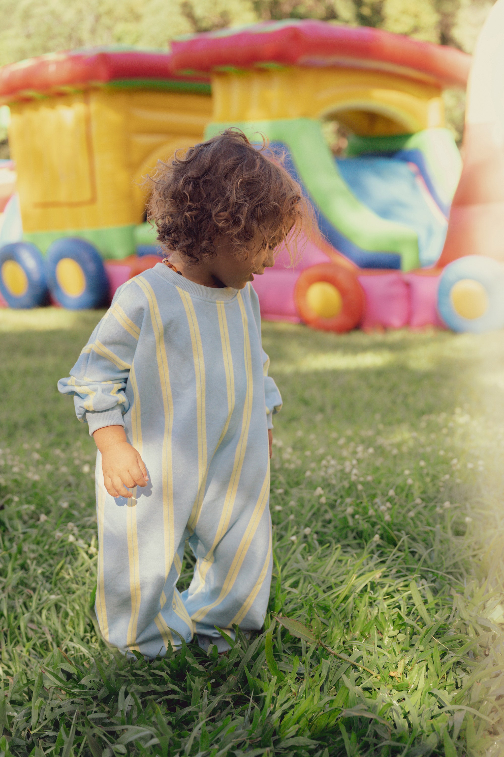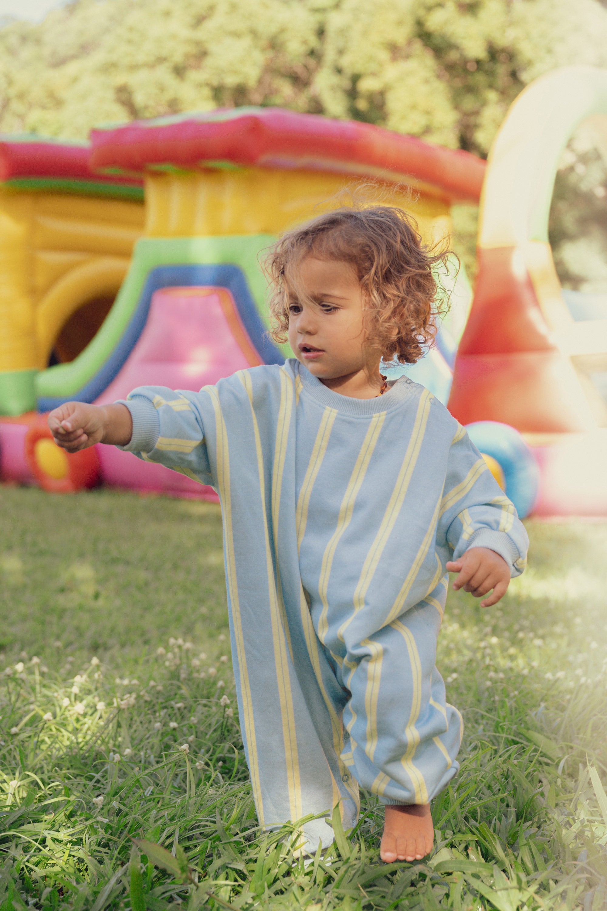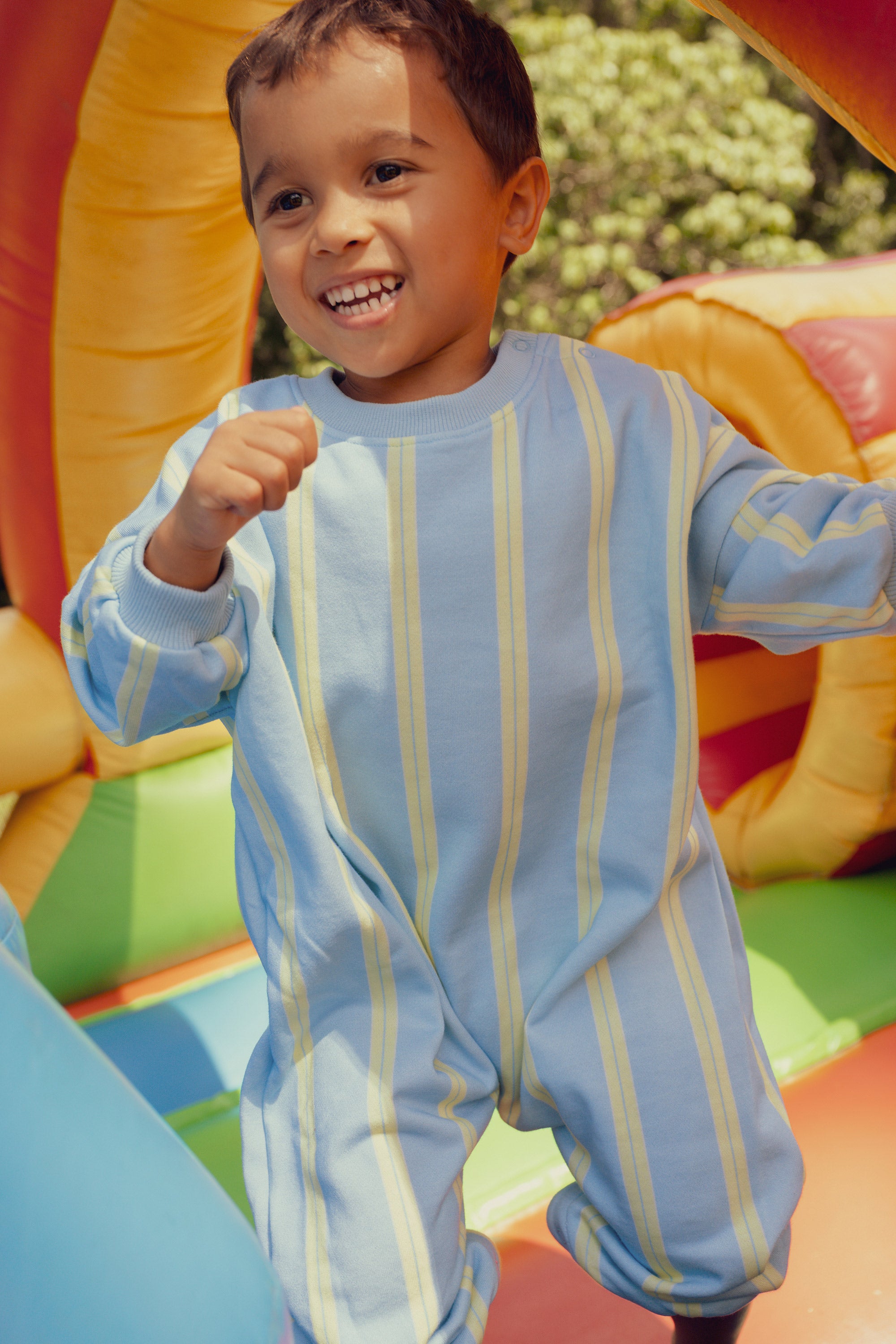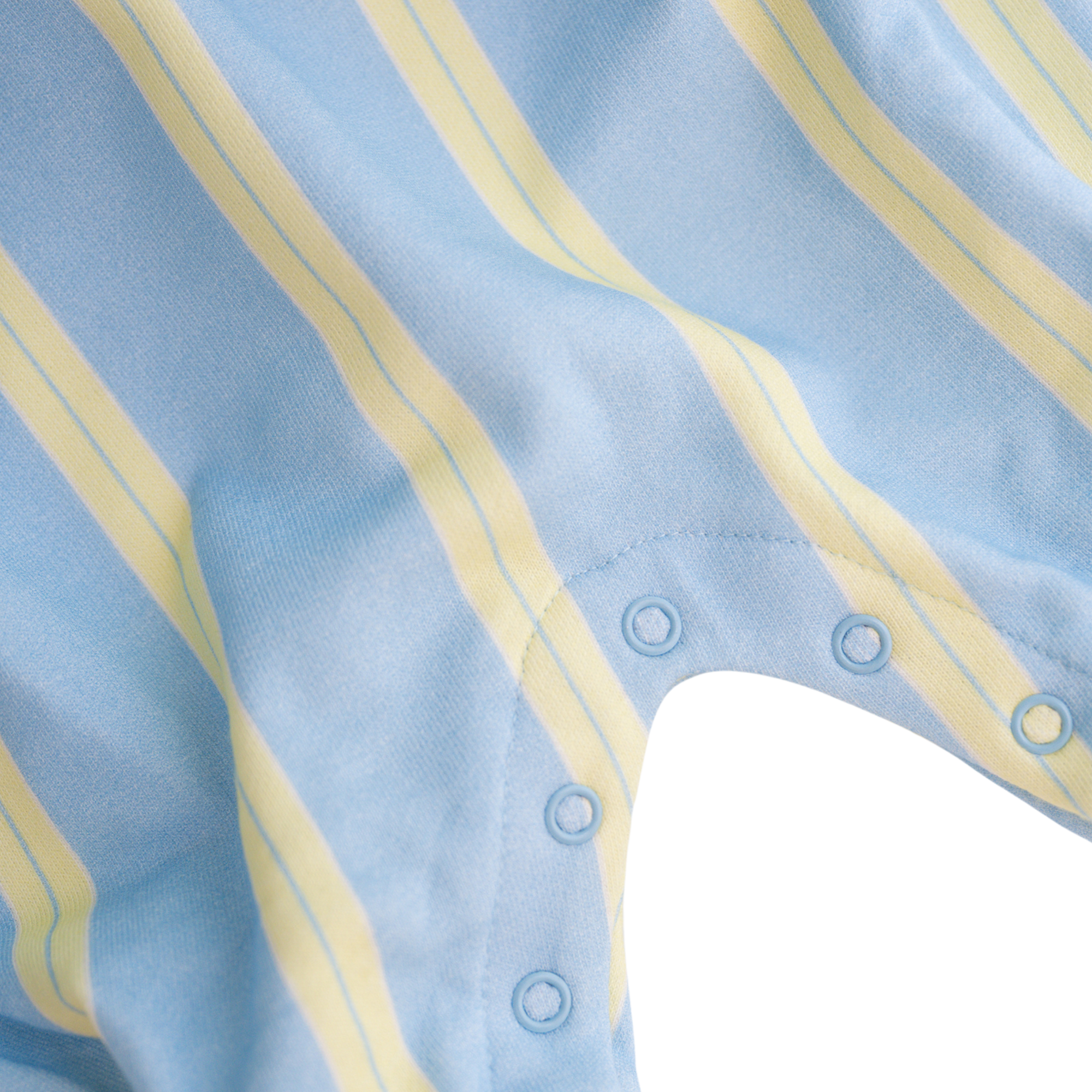 Designed for ultimate comfort, this lounge suit features playful vertical prism stripes in fresh sky blue and lemon lime tones and practical snap buttons for convenience. Ideal for everyday wear and relaxed moments.